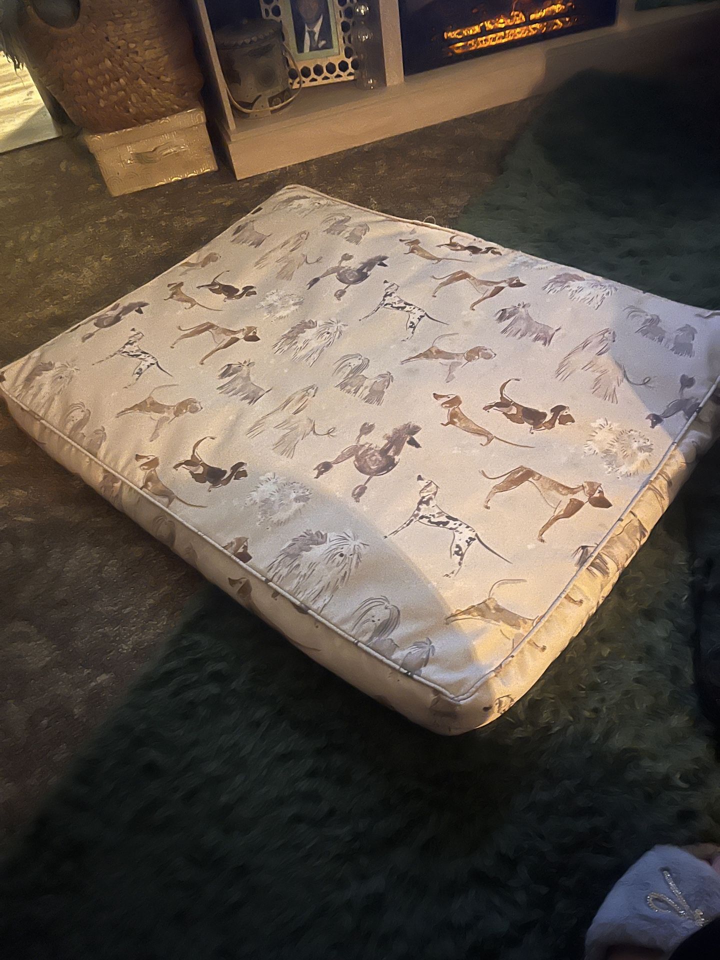 Doggy bed hardly used our dog is stuck on his old worn in one. Clean. Jus washed to sell no stains marks holes nothing. Has a zipper to wash the cover very easy to do. Mpu.