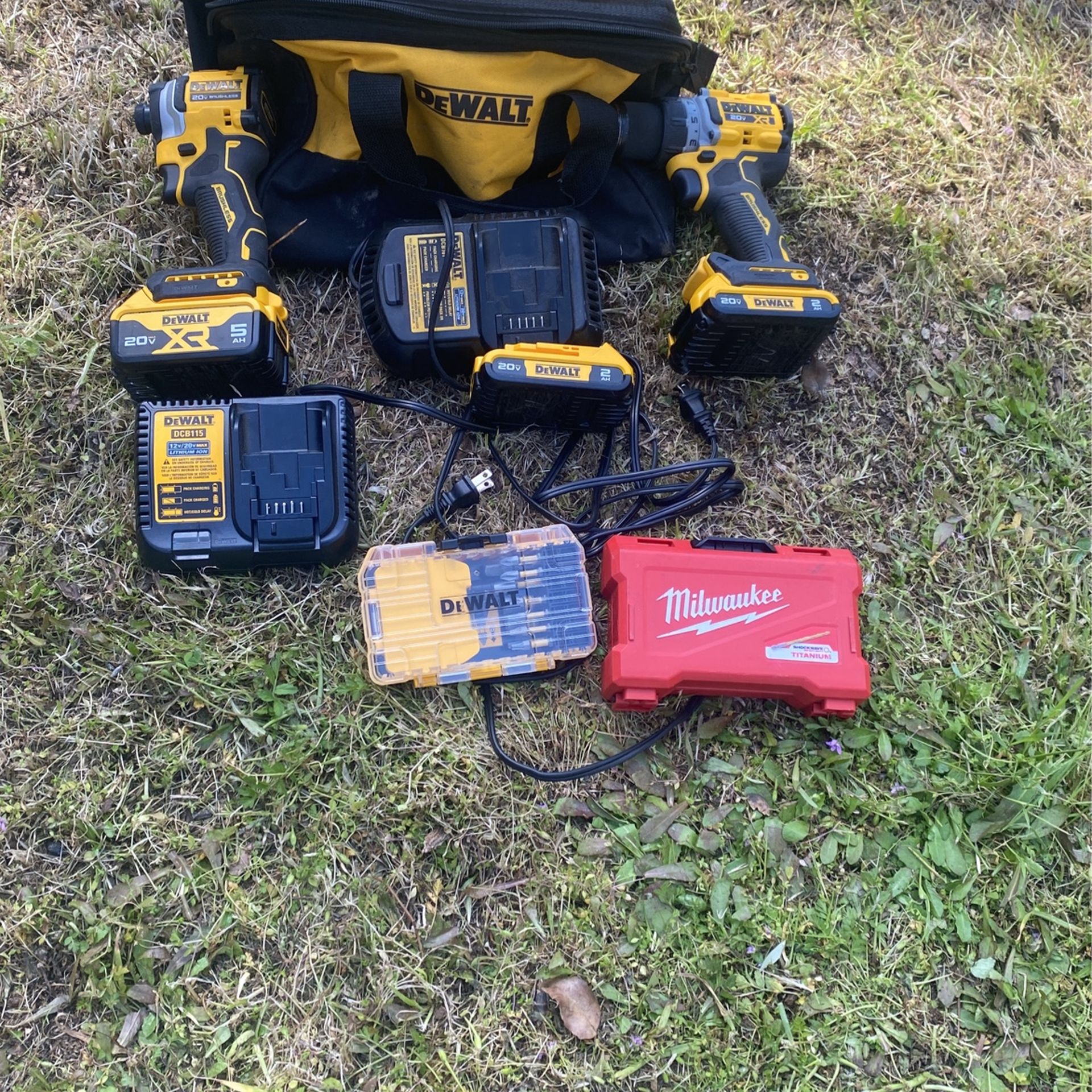 Dewalt tools, drill compact drill, two battery chargers three batteries 20 V with the set of the wall tools that he hast to drill also a Dewalt bg and
