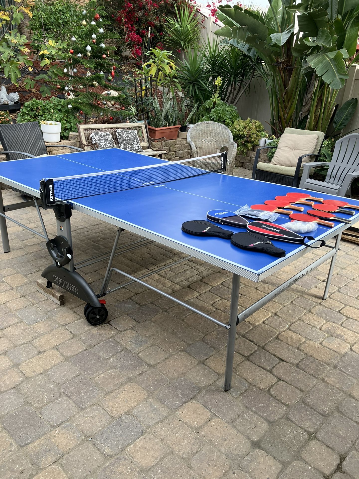 Made with a heavy-duty steel frame, unlike many cheaply made tables. The table was always kept covered; the cover recently ripped and was thrown away. It is currently stored outside under a covered patio. Please note: one wheel is broken, but the table is leveled with two pieces of wood and works great. Includes: • 8 paddles • Lots of high-quality balls • Paddle covers • Net included • Net in the bag is the previous net • Net currently on the table is brand new