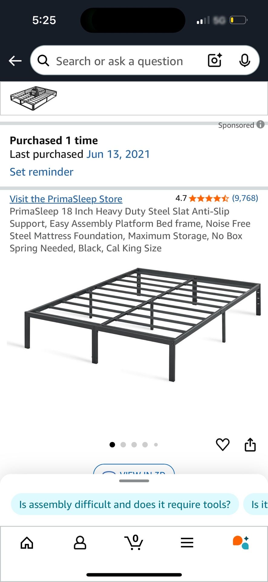 Gently used Cal King size PrimaSleep 18” Heavy Duty Steel Slat Platform Bed Frame. Purchased in 2021. No box spring needed—easy to assemble. Disassembled and ready for pickup.