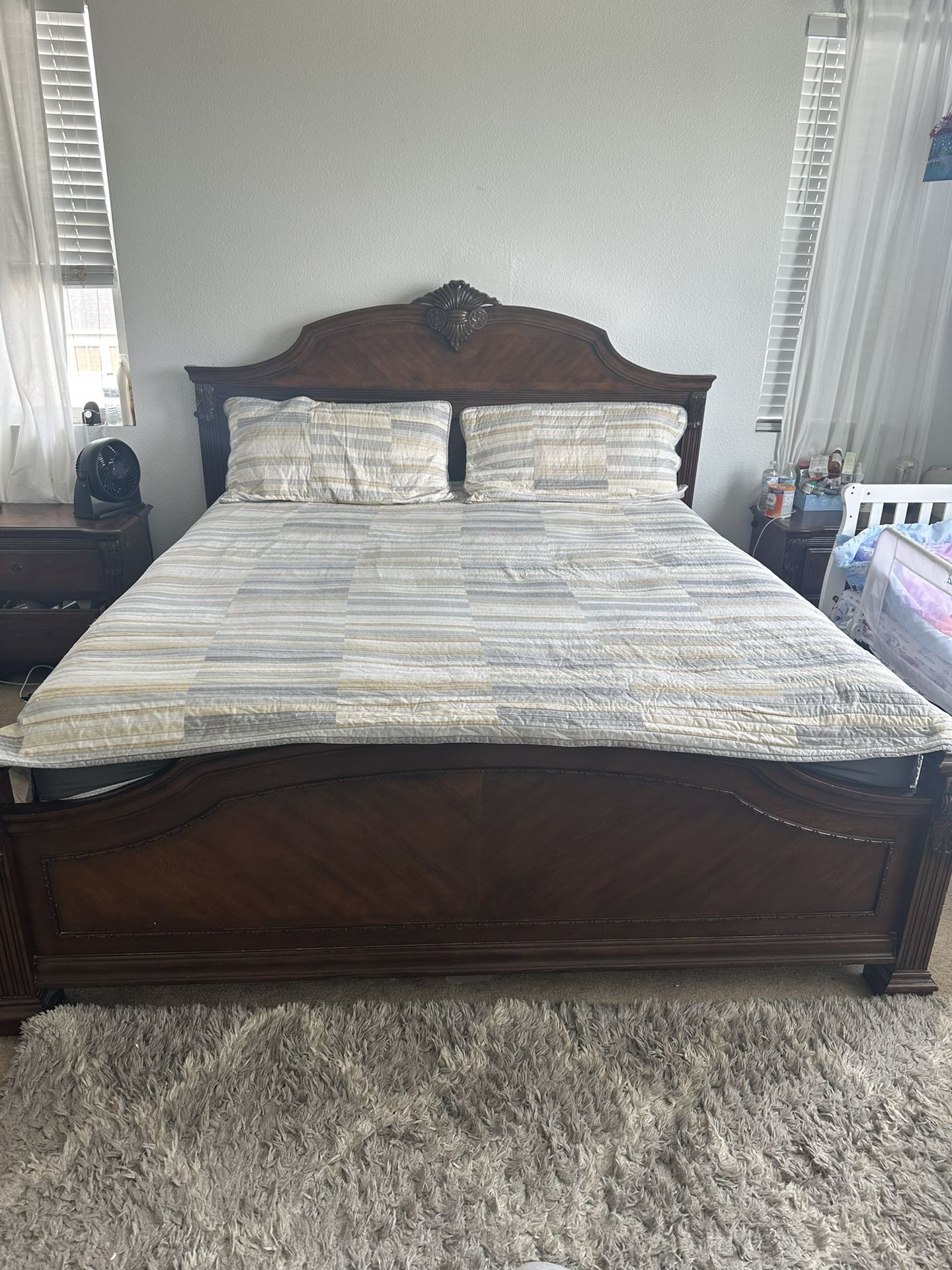 Cal king bed set $250 Wearing shown in photos Just trims have wear but I usually would touch up with furniture marker works great The last photo of a chip is of the back end of one of the nightstands Overall great set, my loss your gain This set costs me about $1900 when I bought Bed Dresser Two night stands NO BOX SPRING AND MATTRESS!