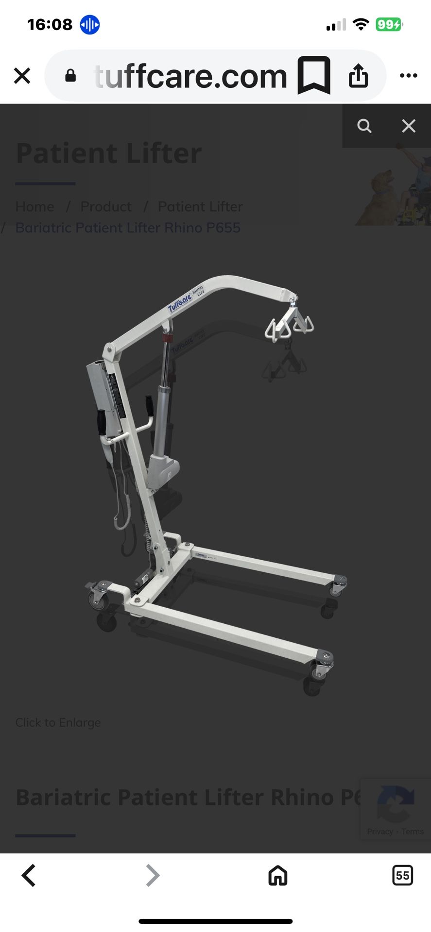 Tuffcare Rhino Hoyer Lift. Hardly used equipment. Needing new battery pack and charger. Checked on google originally $1700.00 on eBay. “Good deal”