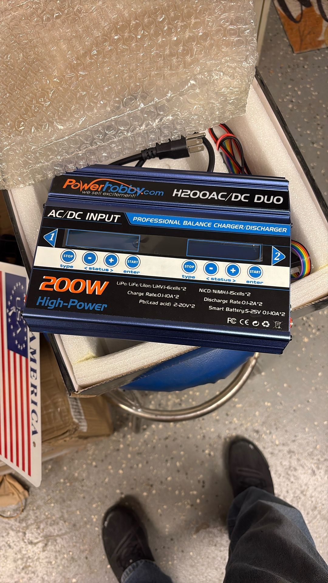 This is a RC car battery charger brand new. I lost one of the wires, but you don’t need it. You can buy extra or make them. It can charge two different batteries at the same time.