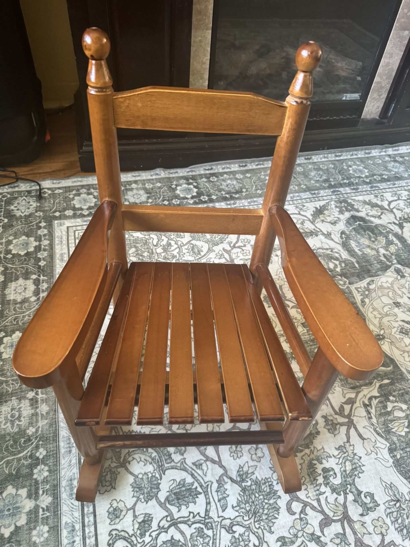 New condition too small for my son. Holds up to 50 pounds. Wood rocking chair. Payed more than $60 It has a small chipped mark on the back part as seen on pics. Barely noticeablef. $50 PICK UP ONLY ๐ Boyle heights CA