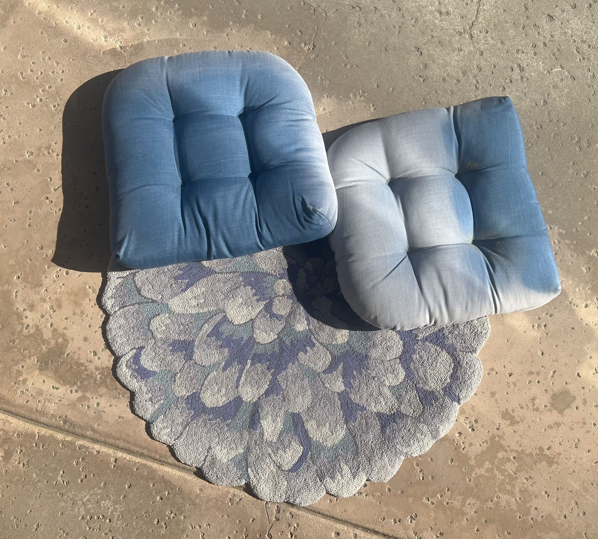 4 cushions 19x19” faded one side. I’ve shown both sides. It’s amazing what inexpensive cushion covers from Amazon can do! They are good quality and thick. All cushions are the same. Carpet is 2x3 1/2’. I used this outside so it is dusty. Originally paid $150 for all. Pick up in Avondale Golf Club, 92211.