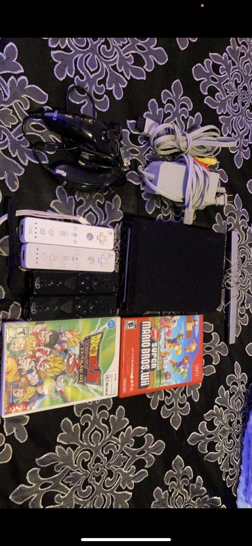 Great condition wii Nintendo that comes with •2 amazing and fun games to play( super Mario bros wii and dragon ball z budokai tenkaichi 3) • 4 controllers • all the cords included • and 2 additional black nun chuck controllers All this for a good price so let me know if interested! Price can be negotiable