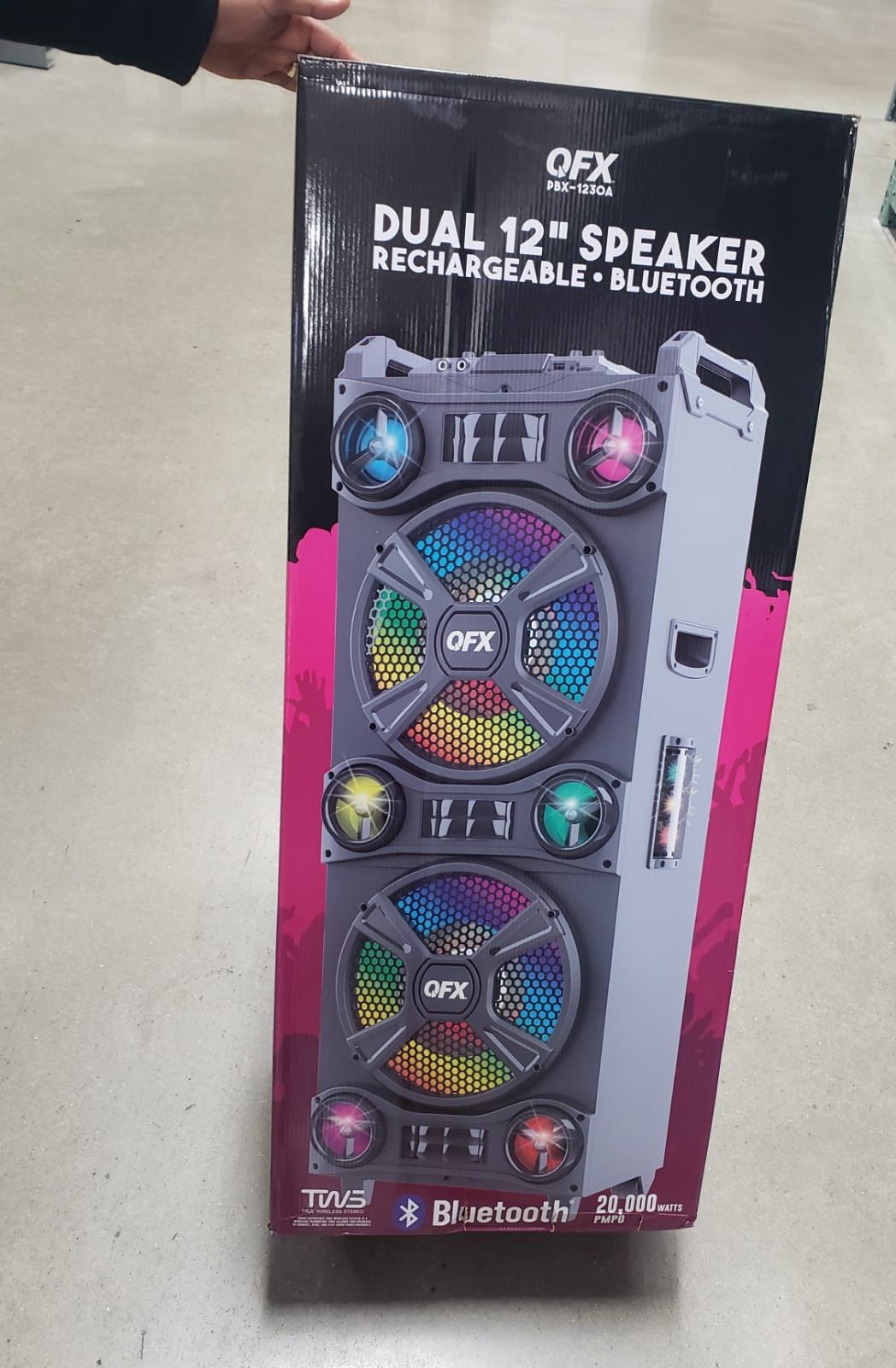 El altavoz Bluetooth portátil recargable QFX de 12 "cuenta con dos altavoces Bluetooth recargables de 12" con barras de luz a los lados y en la parte superior, tweeter de 1 ", estéreo inalámbrico TWS verdadero, luces de fiesta LED envolventes, radio FM, entrada auxiliar, puerto USB y control remoto . Para disfrutar de este altavoz dual de 12 "de alta potencia, simplemente conecte su dispositivo inteligente a través de Bluetooth. Es fácil de llevar a eventos familiares, deportivos o de entretenimiento en casa. Puedes usarlo tanto en interiores como en exteriores. Las luces LED envolventes y las barras de luz crean un maravilloso espectáculo de luces para la música. The QFX 12" Portable Rechargeable Bluetooth Speaker features two 12" rechargeable Bluetooth speakers with light bars on the sides and top, 1" tweeter, TWS true wireless stereo, surrounds LED party lights, FM radio, Aux input, USB port, and remote control. To enjoy this high-powered dual 12" speaker simply connect your smart device via Bluetooth. It is easy to bring to family events, sporting events, or home entertainment. You can use it indoors and as well as outdoor. The surround LED lights and light bars create a wonderful light show for the music.