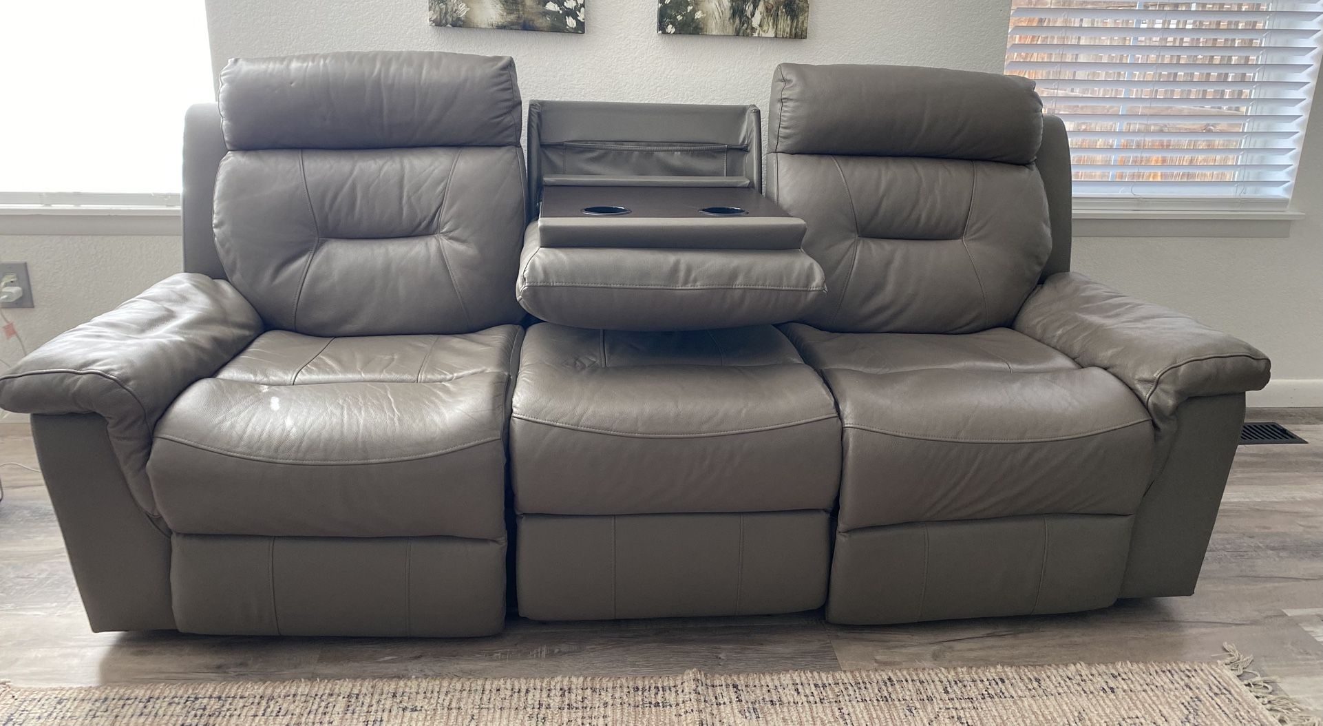 Gray leather recliner sofa from AFW. Has drop down table with cup holders. Both ends recline. One end gets a little stuck but still works. 87x40. Smoke/pet free home. Asking $300