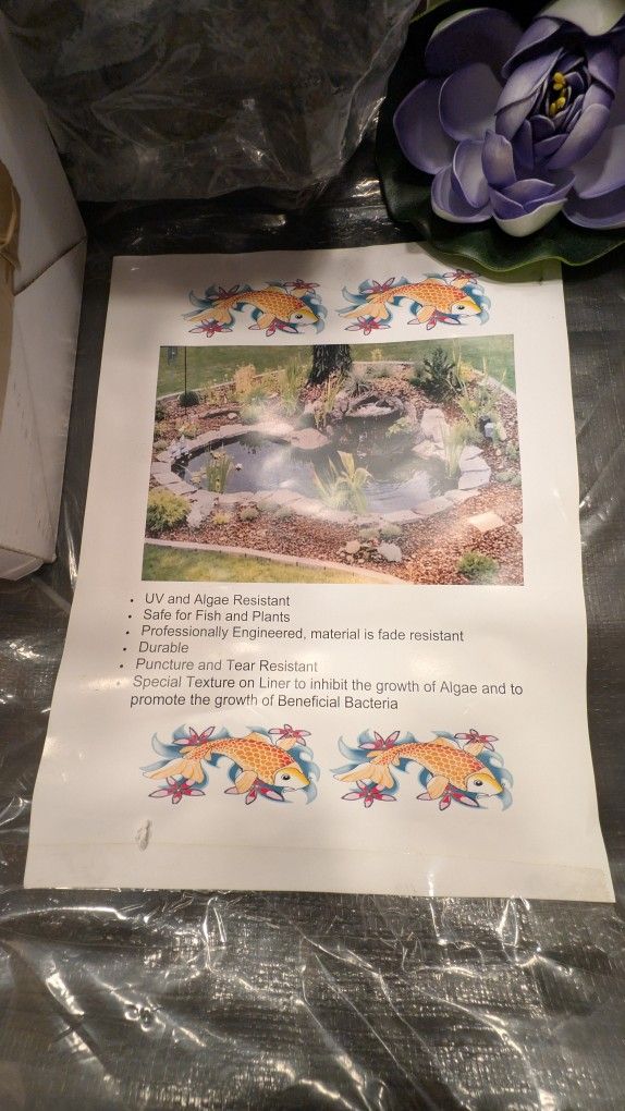 13 X 15 Pond Liner with Pond Lillies Comes with 640GPH pump and instructions Brand new in box, never used $100.00 OBO