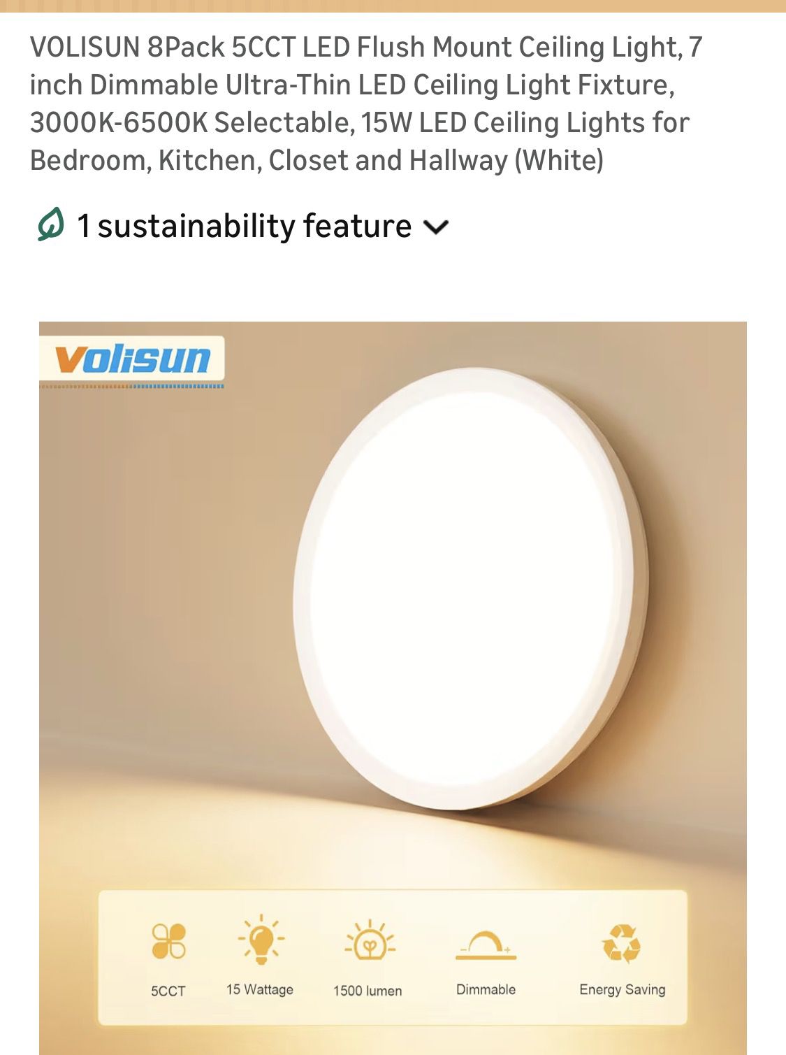 Brand new packed in box VOLISUN 8Pack 5CCT LED Flush Mount Ceiling Light, 7 inch Dimmable Ultra-Thin LED Ceiling Light Fixture, 3000K-6500K Selectable, 15W LED Ceiling Lights for Bedroom, Kitchen, Closet and Hallway (White)