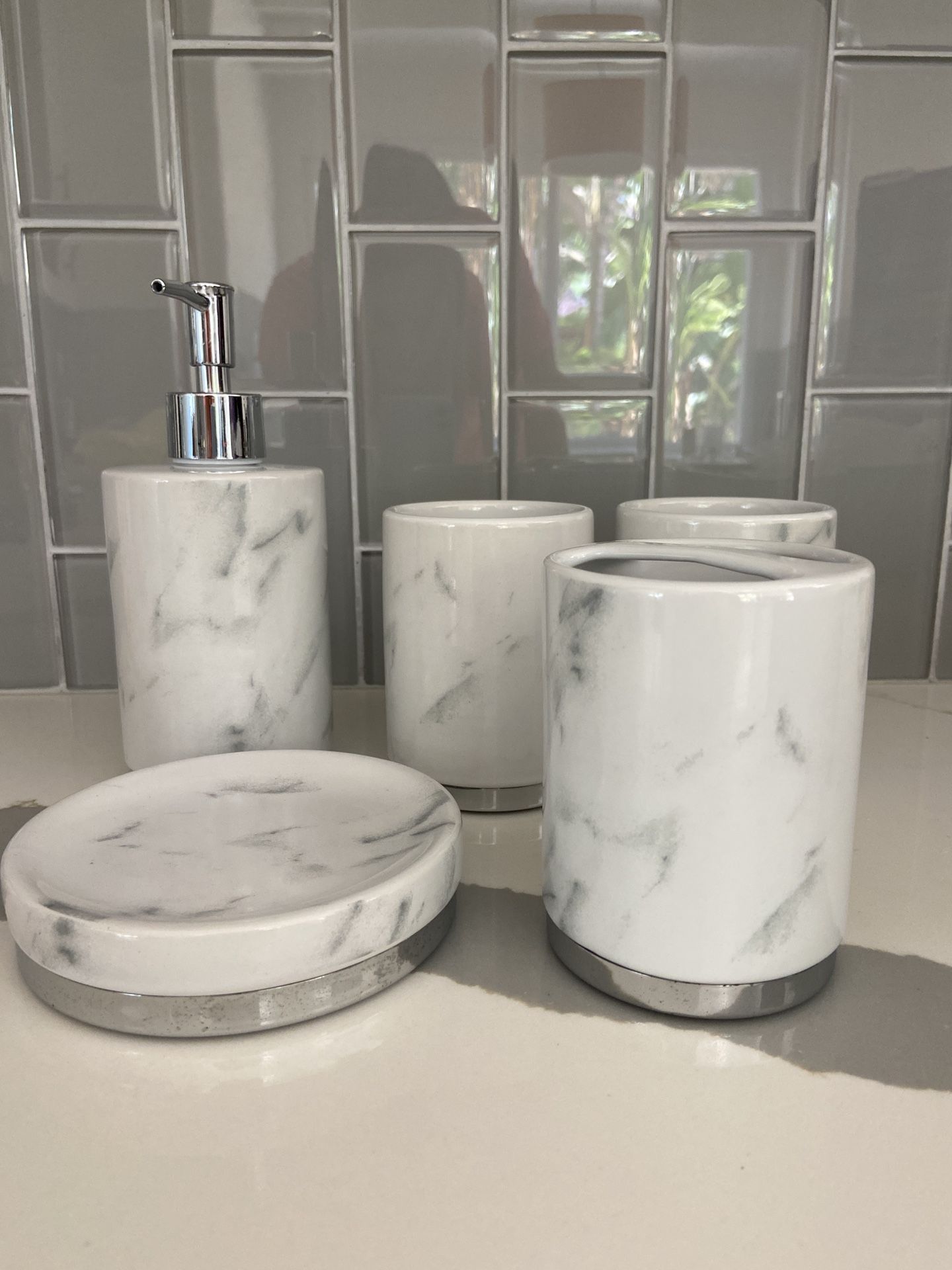 Willow & Ivory™ Bathroom Accessories Set | 5 Piece Ceramic Bath Set | Includes Toothbrush Holder, Soap Dispenser, Soap Dish, 2 Tumblers 3 of 5 pieces lightly used for 6 months, selling because we moved and the style no longer matches our bathroom Originally purchased on Amazon for $39.99 Comes in the original box / packaging Link to original item: https://offerup.com/redirect/?o=aHR0cHM6Ly93d3cuYW1hem9uLmNvbS9kcC9CMDdKSFJNWDhUP3JlZl89cHB4X2h6c2VhcmNoX2Nvbm5fZHRfYl9mZWRfYXNpbl90aXRsZV8y