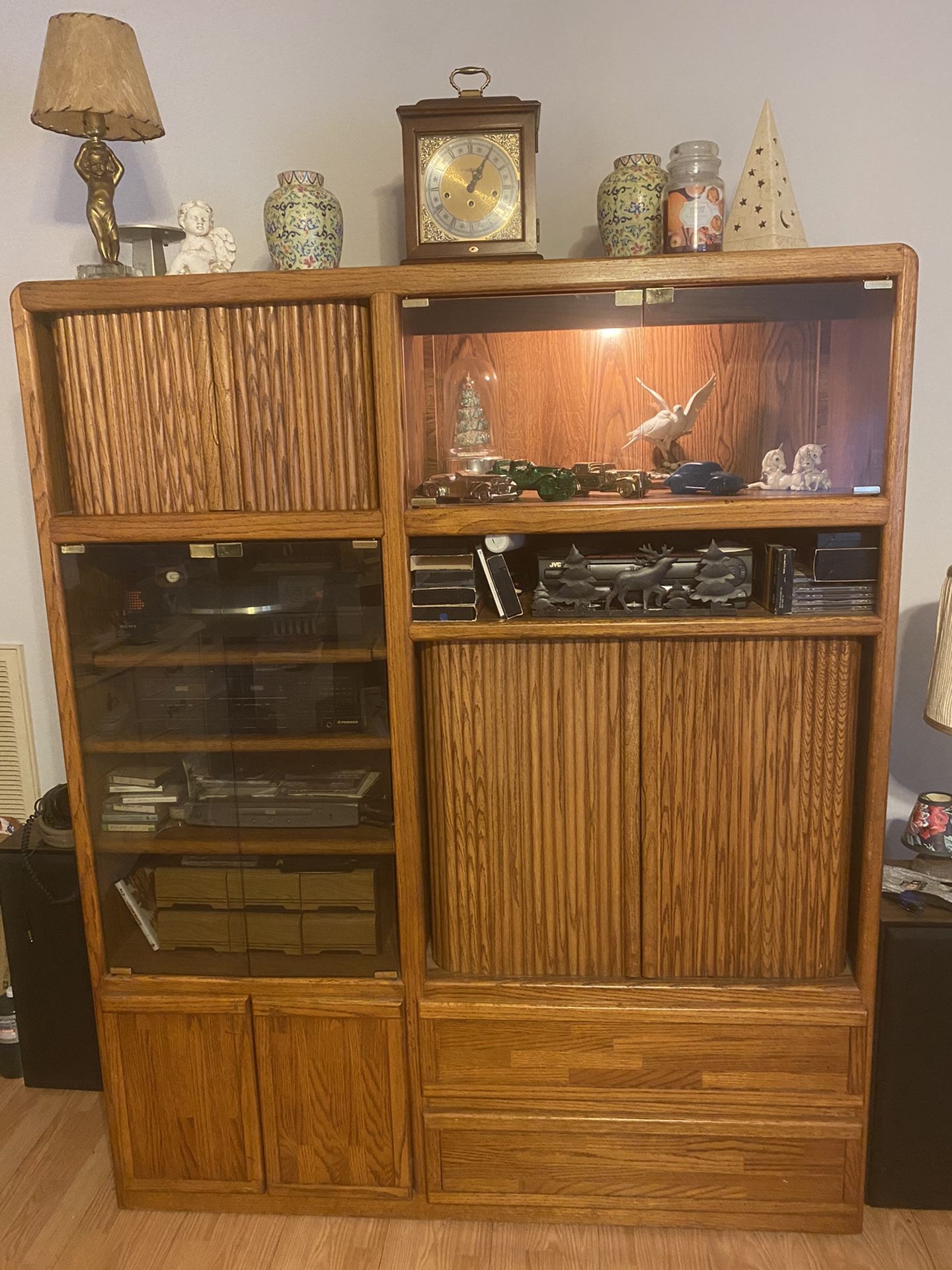 This SUPER nice entertainment center holds a ton- 32” flat screen, game console, stereo, games,cds, albums, collectibles- whatever suits your needs! Great for consolidating and keeping organized in a small space! In great condition- no scratches! Section on top right has a light to show off your special curios! Measures 55”across front x 67”H x 17”deep. Curio area 14”H x 30”W, TV area 24”H x 30”W. Drawers under tv slide nicely. No chips in glass doors, can be removed if going in child’s room. This was very expensive when purchased new. Please make sure you come prepared with a vehicle that will fit it and at least 2 or 3 VERY STRONG MEN, it’s HEAVY and I can’t help you move👩🦰 No holds, first come basis, house pick up and cash only, please. Price FIRM. Check out my other 100 unique items and follow me, always adding new things daily!