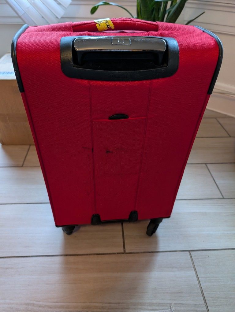 23” x 14” soft-sided suitcase in good used condition. Smooth-rolling wheels and telescoping handle work great. Multiple front zipper compartments for easy access and organized packing. Interior is clean with zipper pockets and compression straps.