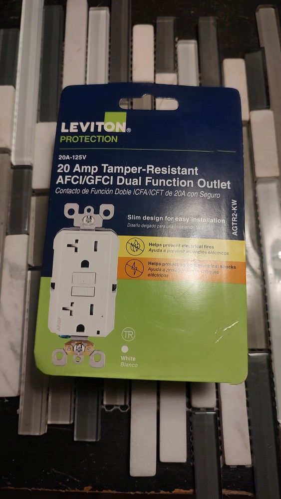 This is a Brand New Un-Opened Item in it's Original Retail Packaging. Model: R12-AGTR2-KW Levitron Protection 20A-125V WHITE 20 Amp Tamper-Resistant AFCI/GFCI Dual Function Outlet. Slim design for easy installation and saves space in wallbox, Helps prevent electric fires, Helps protect against electrical shocks, Levitron GFCIs take up less space in the wallbox vs. other GFCIs. Provides protection against both electrical fire hazards and electric shock, Self test feature helps ensure GFCI is providing protection, Improves child safety - shutter mechanism inside outlet blocks access to the contacts from foreign objects, Required by National Electrical Code (NEC), Backwire option for easy installation. Rated: 20A Outlet, 20A Feed-Through, 125V WA-RXX-AGTRX-12L (PK97872-25-00-0B) Original Retail Price $34.99 I have 3 in total will sell all 3 for 40$