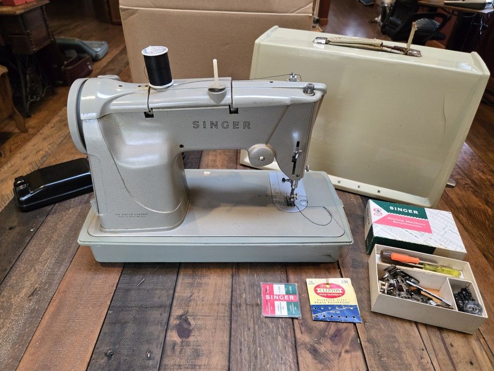 Vintage Singer 328K Sewing Machine with case, pedal, Singer box w sewing machine attachments, powers on great, Box has wear and tear on handle (as pictured). If listed, it's available (please don't ask). Cash only. Please click for other items I'm selling. Bundle pricing.