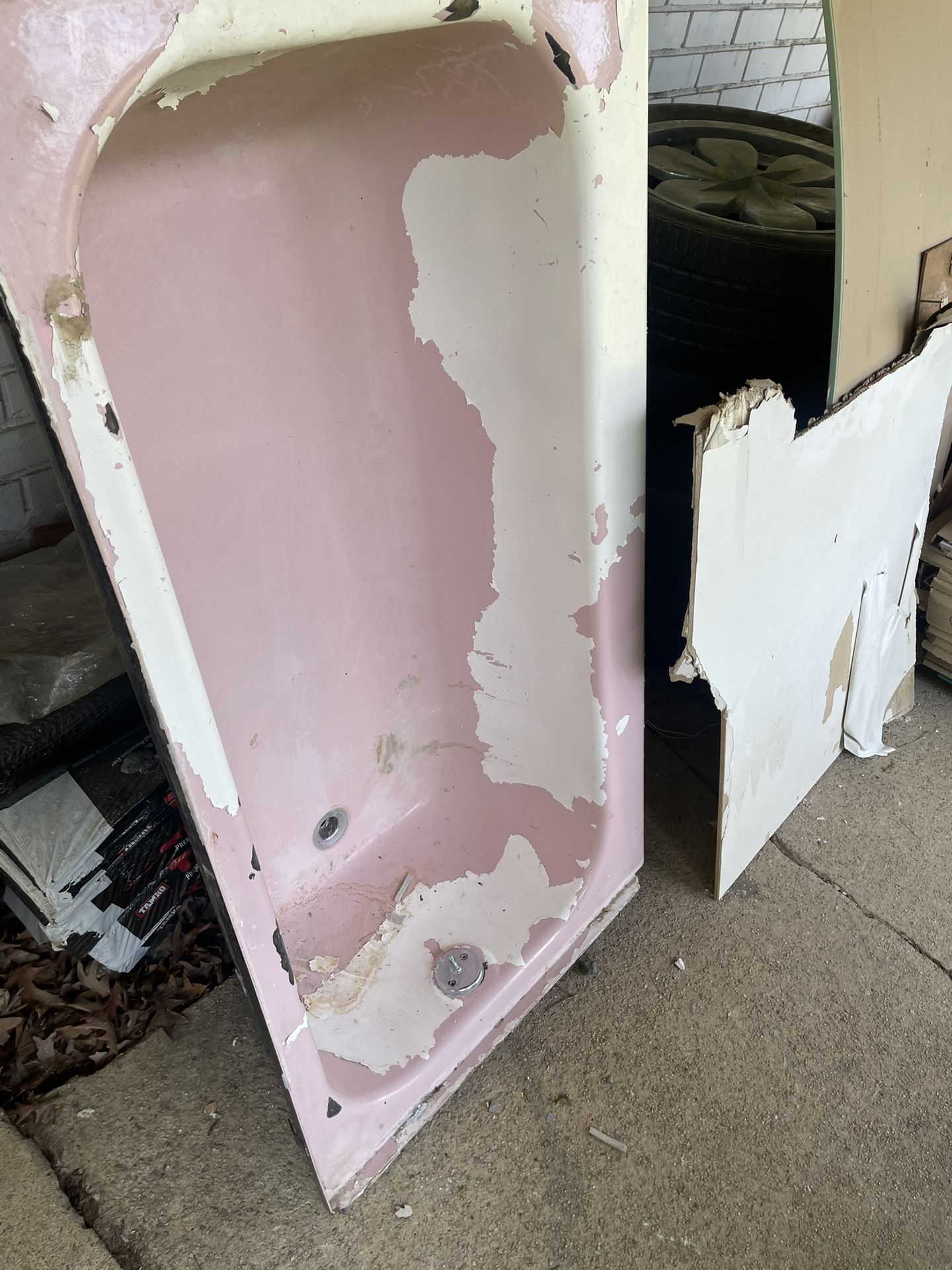 Used tub. Was painted white but the paint is falling off and the under original paint is pink.