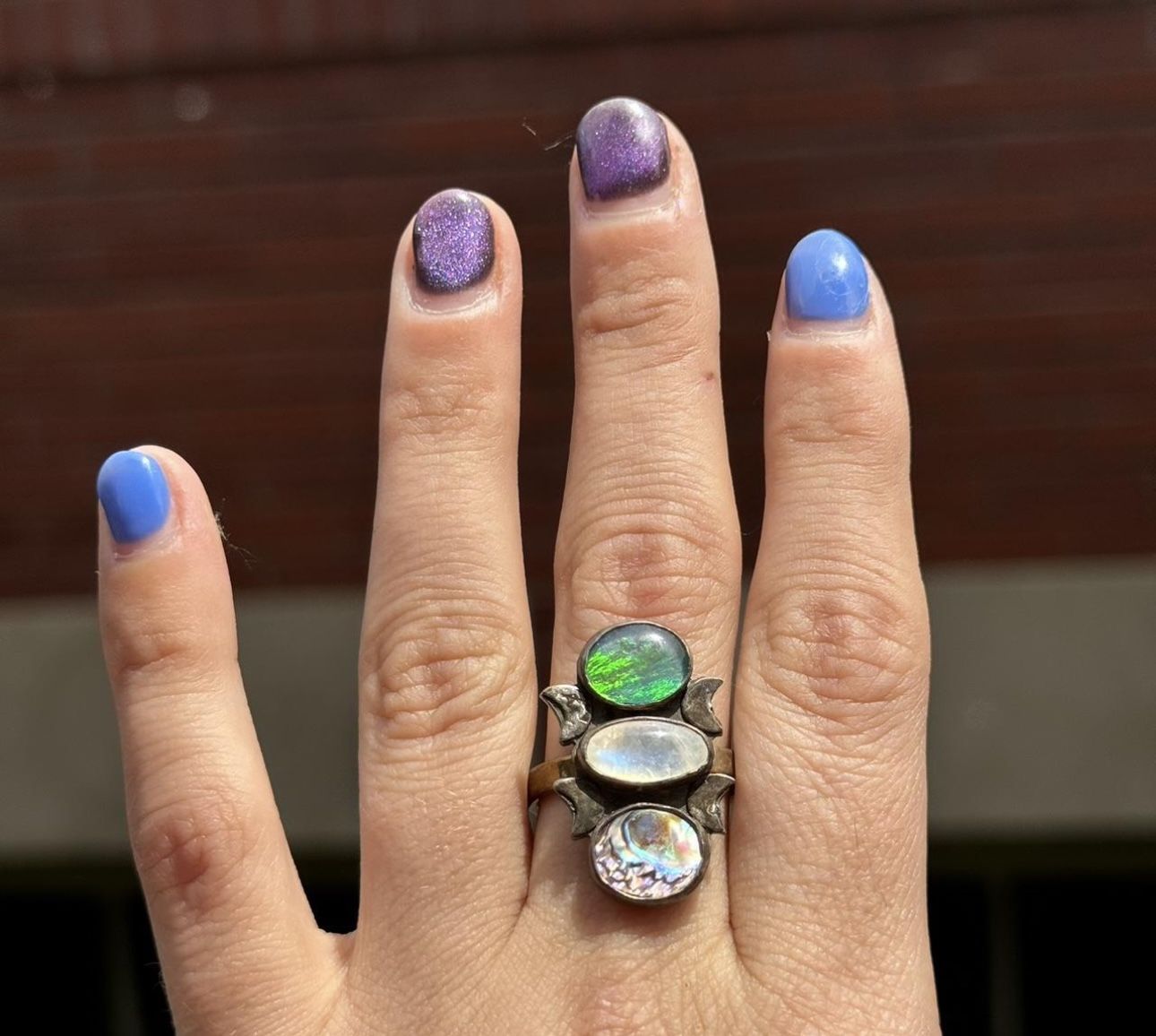 Beautiful handmade sea glass ring with opal stone and abalone shells. Handmade in San Francisco, CA. #rings #seaglass #opal #agate #jewelry. Originally $180 size 7
