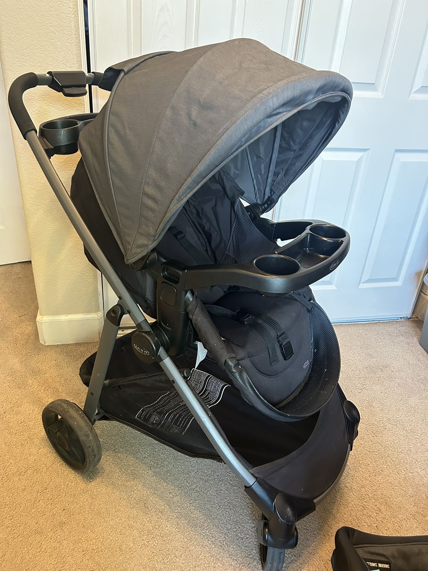 Stroller has some stains but still good. Bundle deal with car seat + base Detachable seat from stroller, can attach car seat to stroller too.