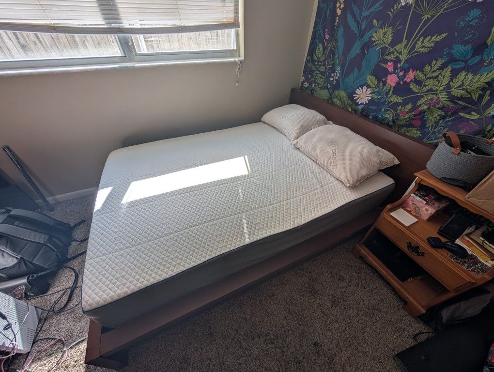 The bed frame is about 3 years old. It's been very lightly used because it has only been used as a bed for guests. There are a few scratches here and there on the frame. The mattress is also lightly used and freshly cleaned. The pillows are included if desired. Otherwise they will be thrown out.