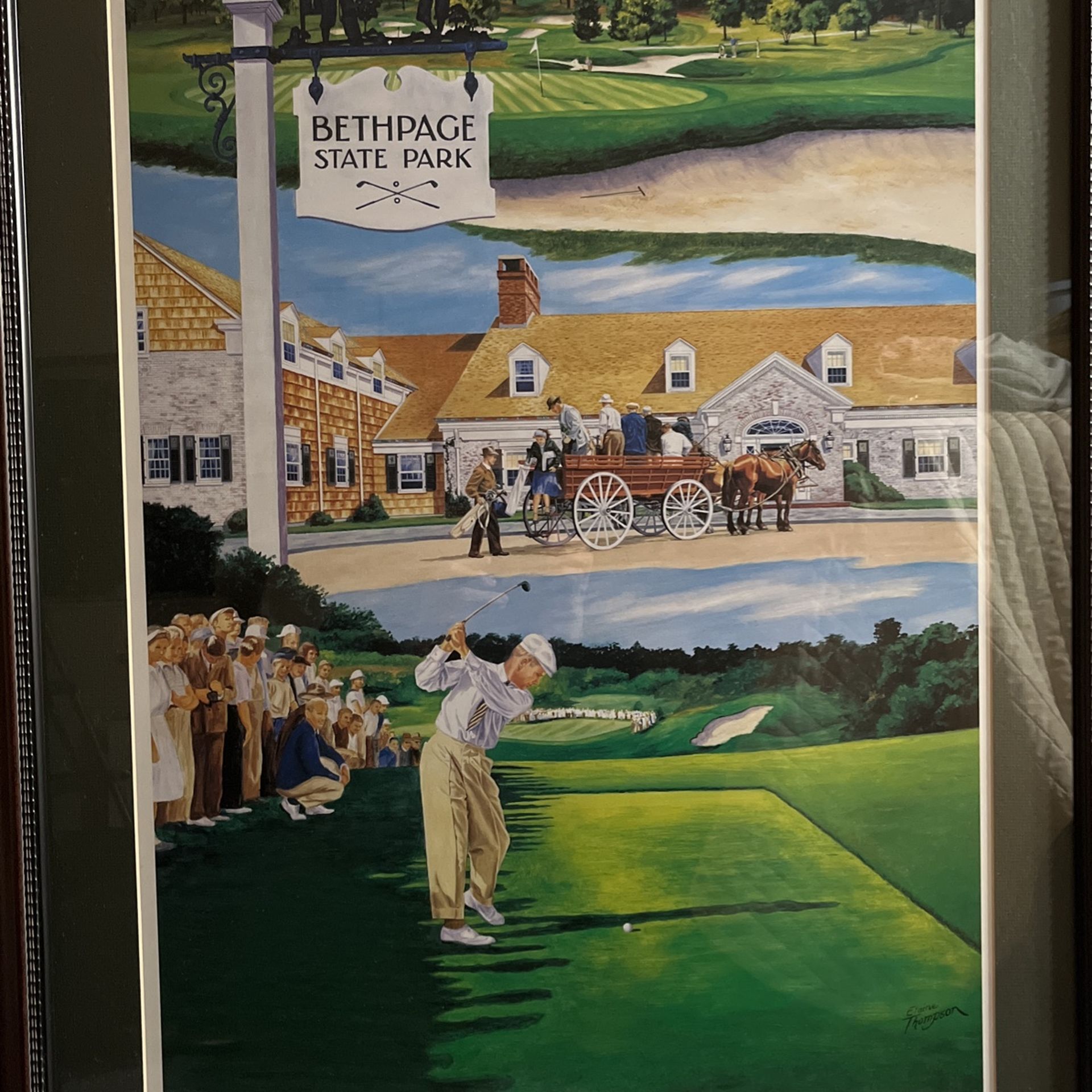 The Black Course, Bethpage, NY Litho Reproduction. Limited Edition #720 of 1600. Size:22”x34”. Certificate of Authenticity, signed by artist: Elaine Faith Thompson. Matted, framed and wired, ready to be hung. Pick up only.
