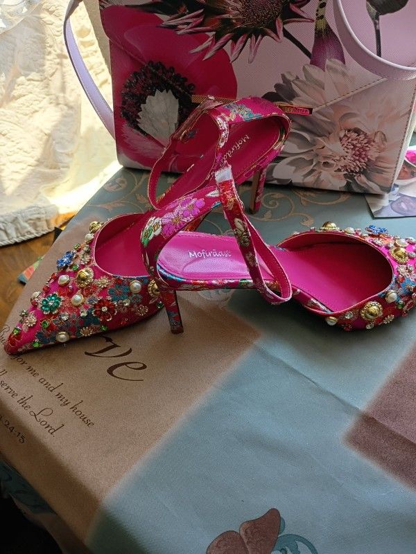 Pink Stilettos size 10 and with a 3inch heel. Previously $99, now on sale for $65. Shoes only, purse not available.