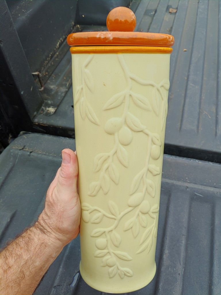 It's over a foot I know that I'm not sure if it's like a ceramic deal it's got a lid I ain't people might put like maybe spaghetti noodles in these or something I don't know