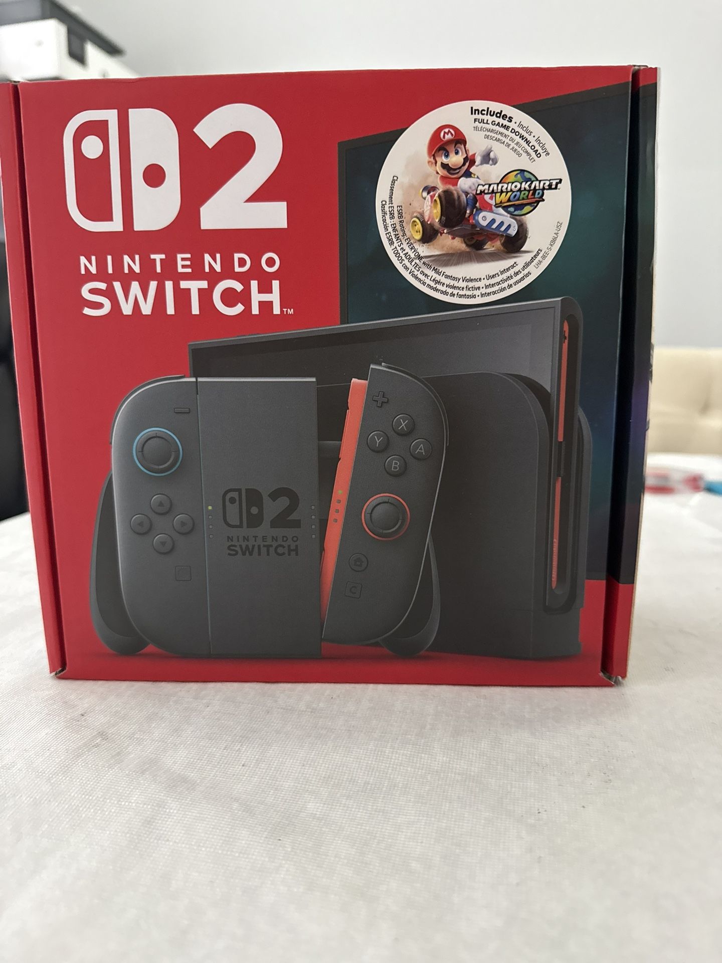 Brand Nee in Box The Nintendo Switch 2 Mario Kart World Console Bundle combines the next-gen gaming experience with the thrill of racing. This bundle includes the Nintendo Switch 2 console and a digital copy of Mario Kart World, allowing players to dive into high-speed action right out of the box. The Joy-Con 2 controllers, in light blue and light red, attach magnetically and offer enhanced control features, including mouse-like precision. Mario Kart World introduces expansive tracks and 24-player races, pushing the boundaries of the franchise. The console’s 7.9-inch HDR touchscreen, 4K docked output, and 256GB storage ensure a seamless and immersive gaming experience. Additional features like GameChat and exclusive N64 game enhancements further enrich gameplay.