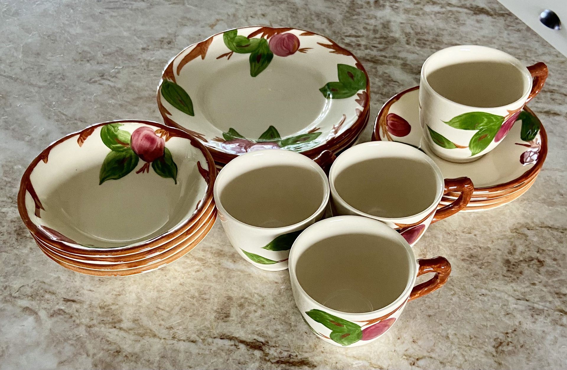 This is FRANSISCAN Apple pattern made in the USA. I have had these in a box for 30 years and never used them. My grandmother bought these for me brand new. There are 4 salad plates 4 cups 4 saucers 4 desert bowls Located in Surprise. Cross streets Bell and Sunrise.