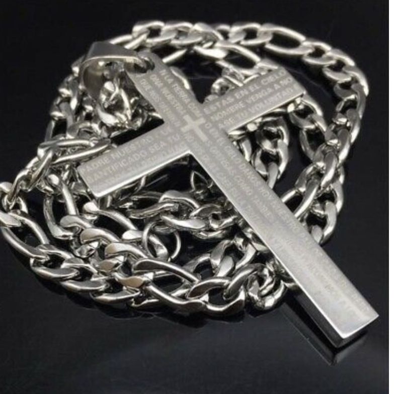 Padre Nuestro (Lord's Prayer )Cross Pendant Figaro Chain Stainless Steel Necklace Size: P:60 40mm Chain:60cm 7mm. stainless steel." 24 “ Figaro Chain Nickel and lead free No returns