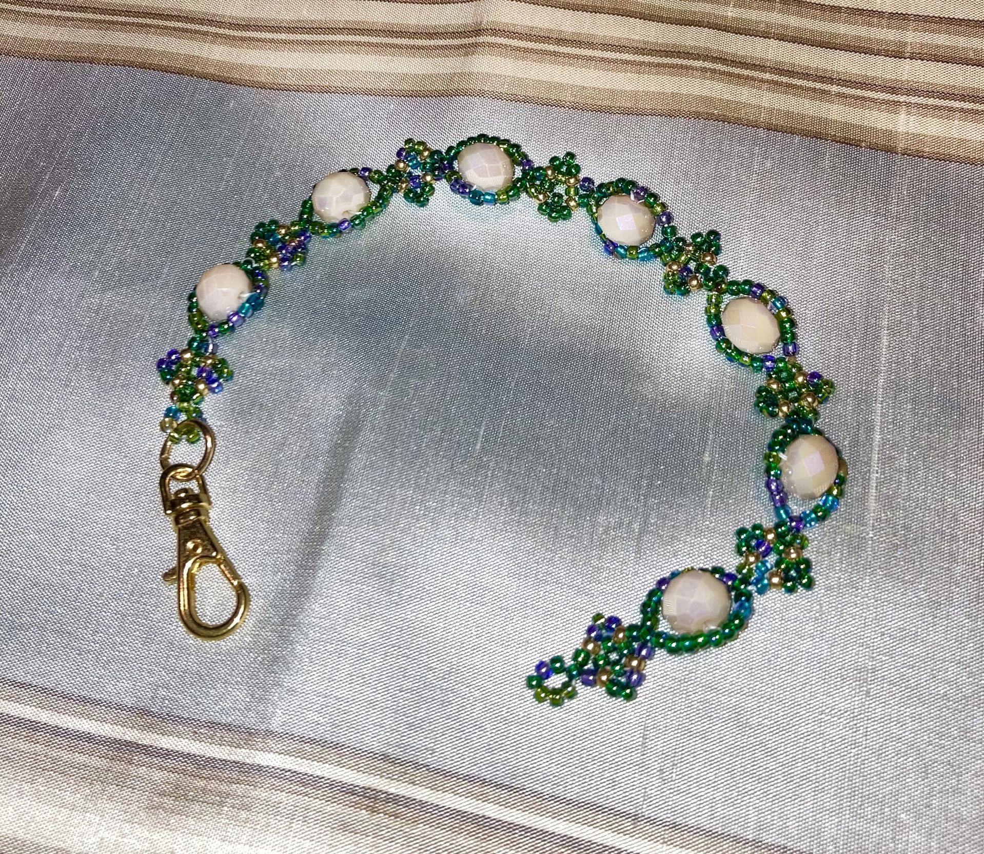 Crystal and seed bead handmade bracelet. Pink Swarovski faceted crystals surrounded by AB green and gold seed beads. 7 1/2 inches long. Gold lobster claw clasp.