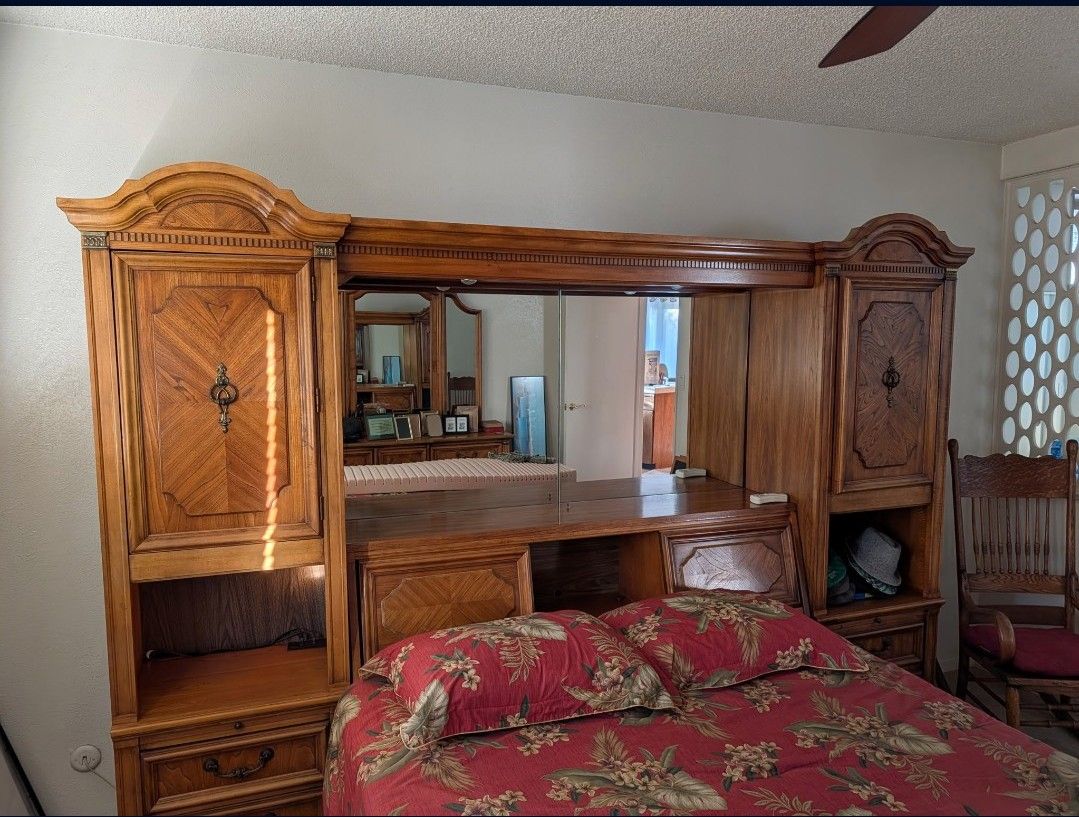 Queen size, 3 piece bedroom set. Headboard with drawers and shelves, and dressers with mirror. (Estate sale)