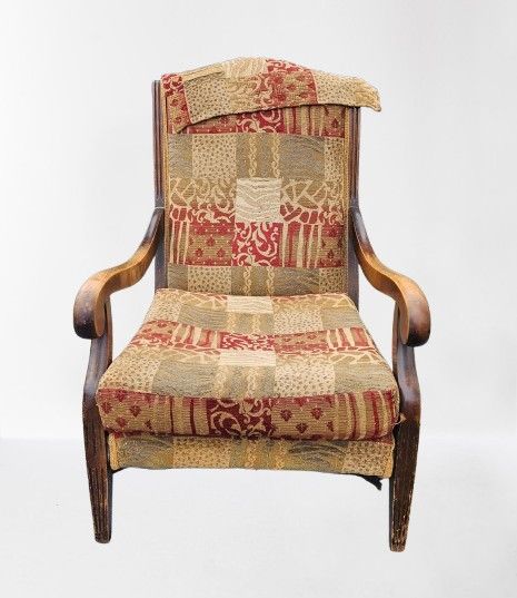 Armchair with a patchwork fabric design from the mid-20th century. Comfortable. Great Accent peice for any livingroom or study. Fully functional but will need a little work to tighten up.