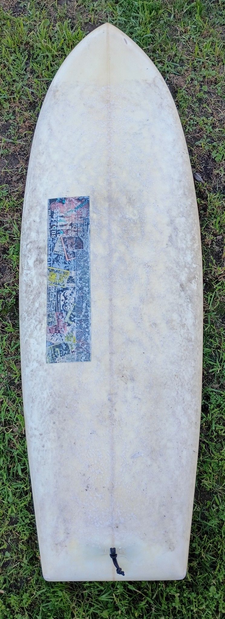 5'4 x 21 chop tail twin fin surfboard originally backyard shaped finless added fcs1 plugs for twins or semi-finless nubs sublime album cover hotcoated into deck will throw in twin fins if no haggling