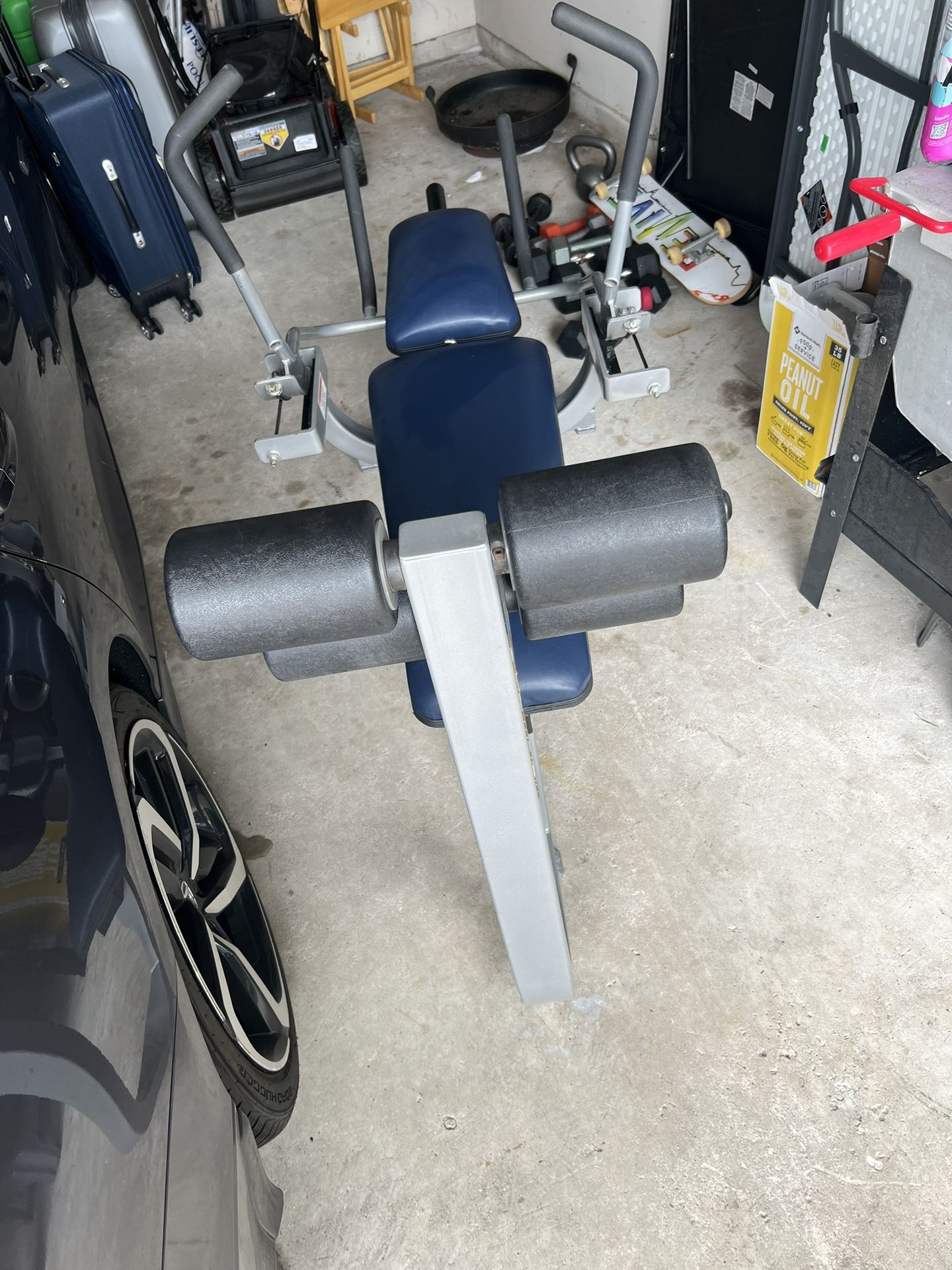 Like new. Rarely used. Heavy commercial style ab bench. Has weight bar to additional weights 79” long (including) weight bar 43” height 29” wide