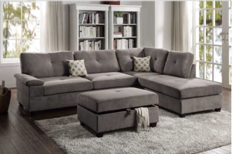 Sectional Sofa $629 Ottoman $119 Item # F6425 Sectional Item # F6427 Ottoman Materials: Charcoal Waffle Suede Dimensions: 116″ x 86″ Reversible Chaise 36″ x 86″ x 37″H, 2 Seat Sofa 36″ x 80″ x 37″H, Ottoman 38″ x 26″ x 19″H Some Assembly Required