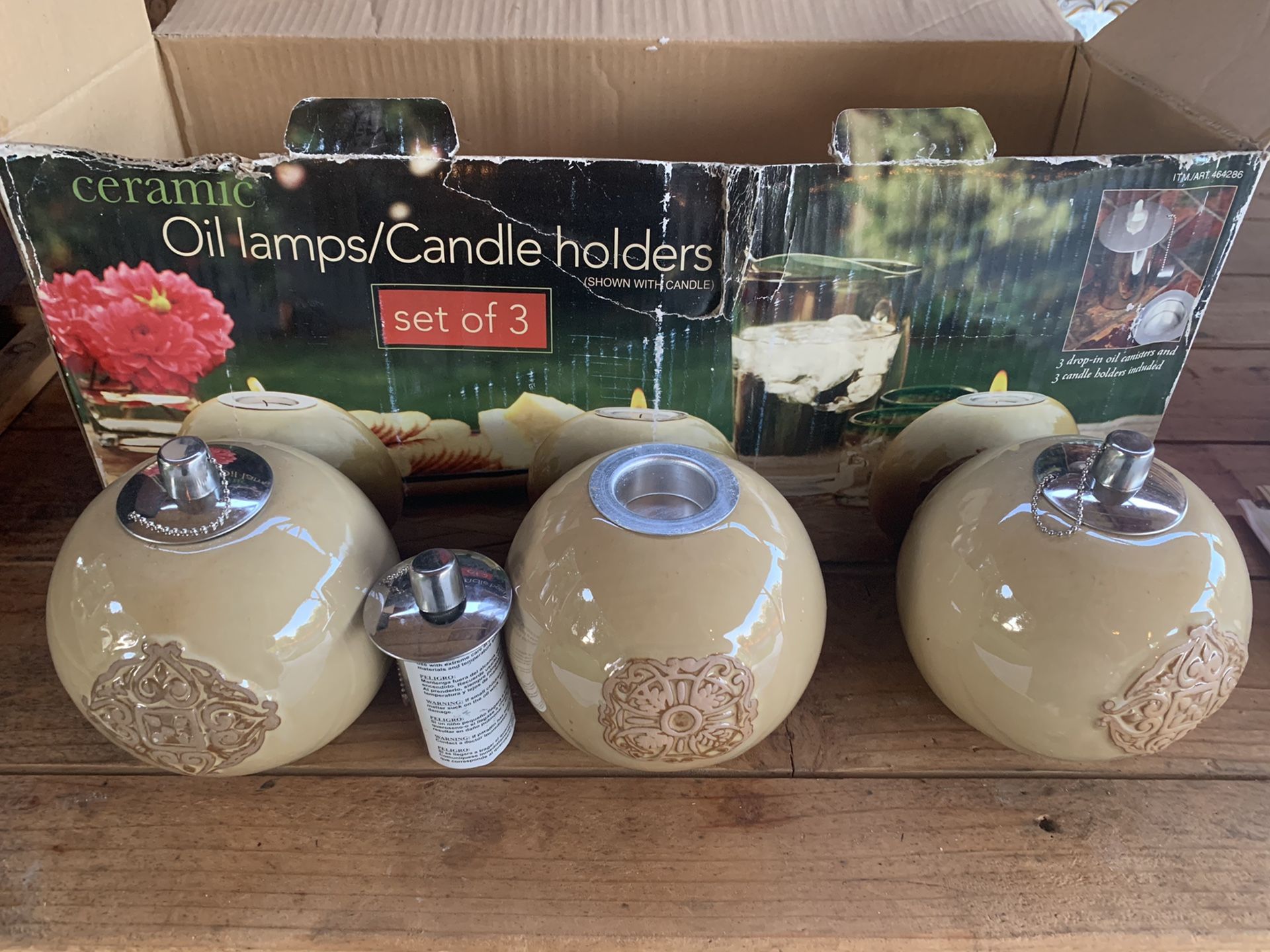 Set of 3 brand new oil lamps. Perfect to fill with mosquito repellant oils outdoors.