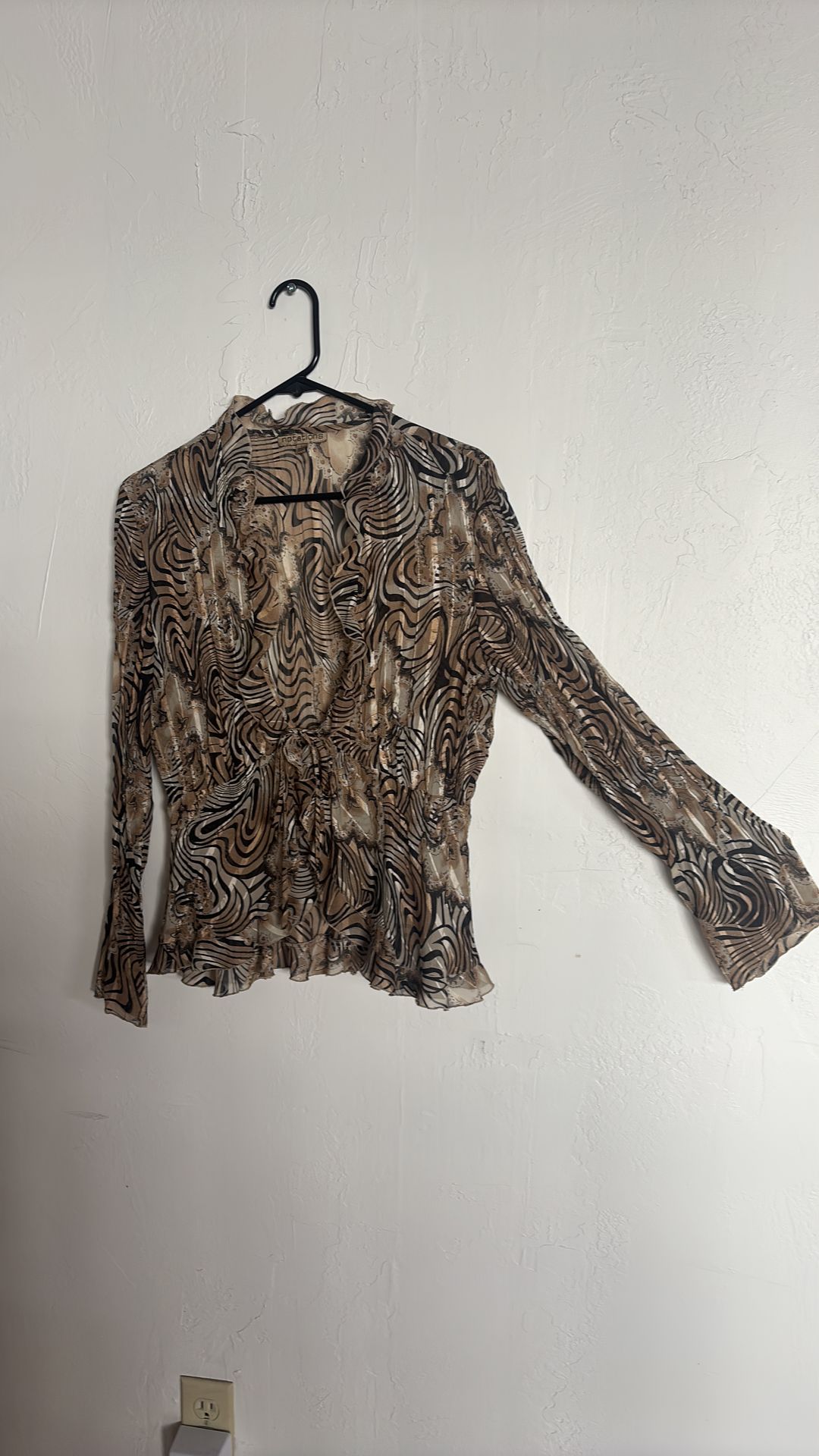 Beautiful sheer and shimmery Animal print blouse. Scalloped neck line and front tie closure.