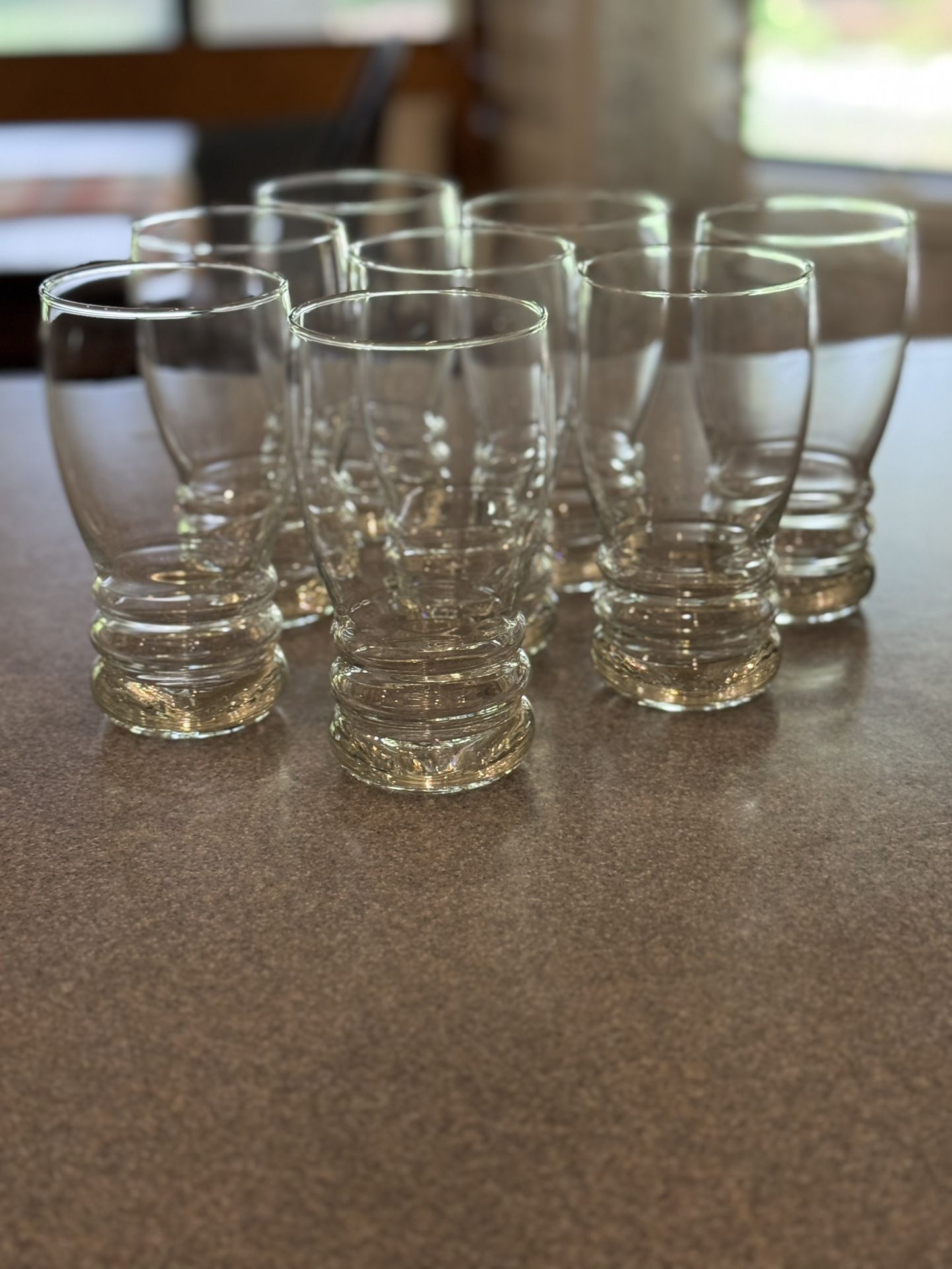 Clear, glass water or a beer glasses Eight available Perfect condition They feel nice when holding them. Combine with matching juice glasses in my listings