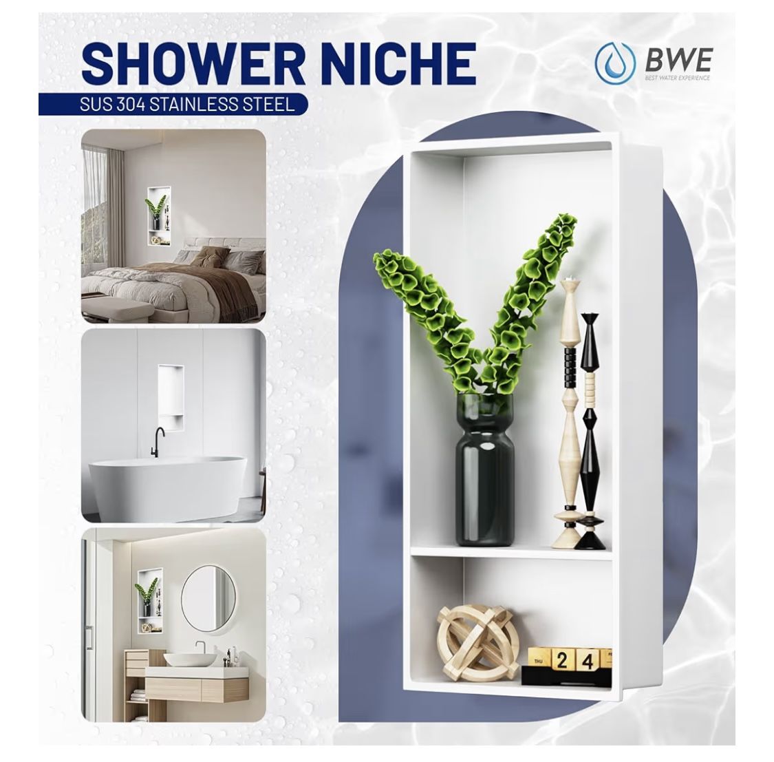BWE 13" X 25" White Stainless Steel Shower Niche, No Tile Needed Wall Niche, Double Shelves Recessed for Bathroom Storage,Over Mount Installation