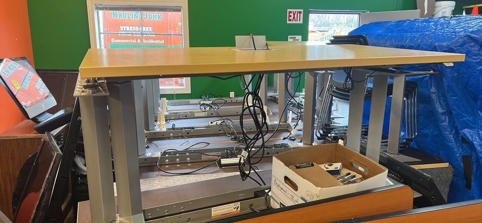 I have 16 separate kimball adjustable desks with power strips located on center top table. Dimensions are 5ft by 30in. Discounted rate for buying multiple Also have a matching conference table with dimensions of 96in by 30in.