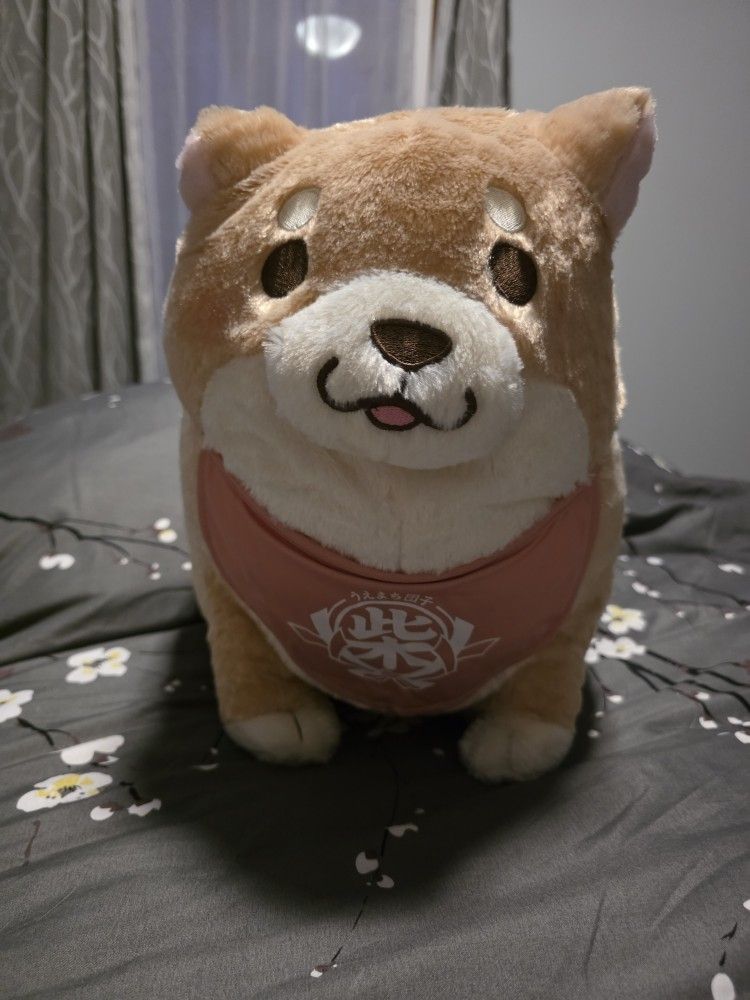 The plush is designed to be very soft and squishy, often released as a UFO catcher (crane game) prize in Japan. The text on the bib, "うえまち子柴" (Uemachi Koshba), refers to the specific line of Mochi Shiba products.