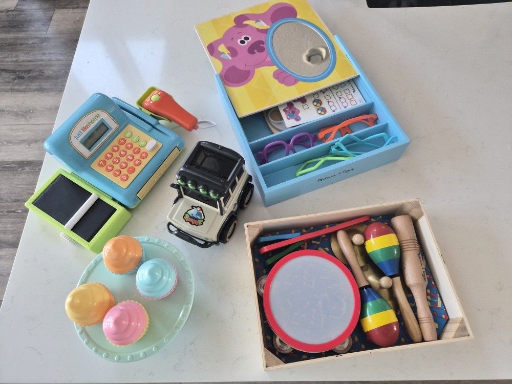 1. Melissa & Doug Blues Clues & You! Time for Glasses Play Set - FSC Certified 2. Melissa & Doug Band-in-a-Box Clap! Clang! Tap! - 10-Piece Musical Instrument Set 3. Just like Home Pretend Play Billing Counter 4. Big Adventures Binocular Searching Safari SUV STEM Toy Vehicle with Binoculars, Flashlight, and Compass for Girls, Boys, Kids Ages 3+ 5. 4 pcs Cup Cakes with Stand
