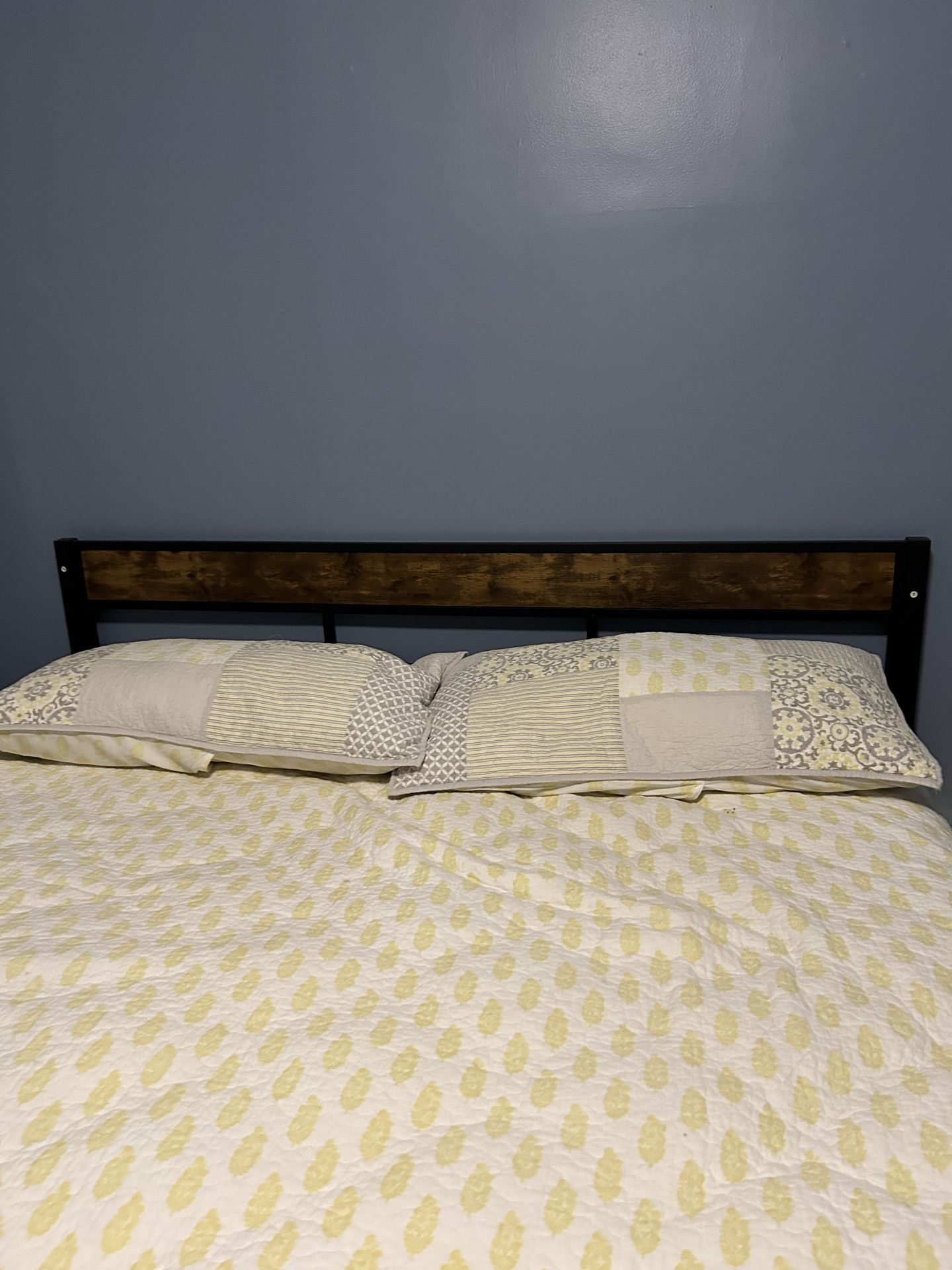 California King Bed, Was used in guest bedroom, bed frame only a year old. Mattress is over 5 years old but has had a mattress protector the whole time. Can include mattress for extra $50 85.8"L x 74.8"W x 40.2"H