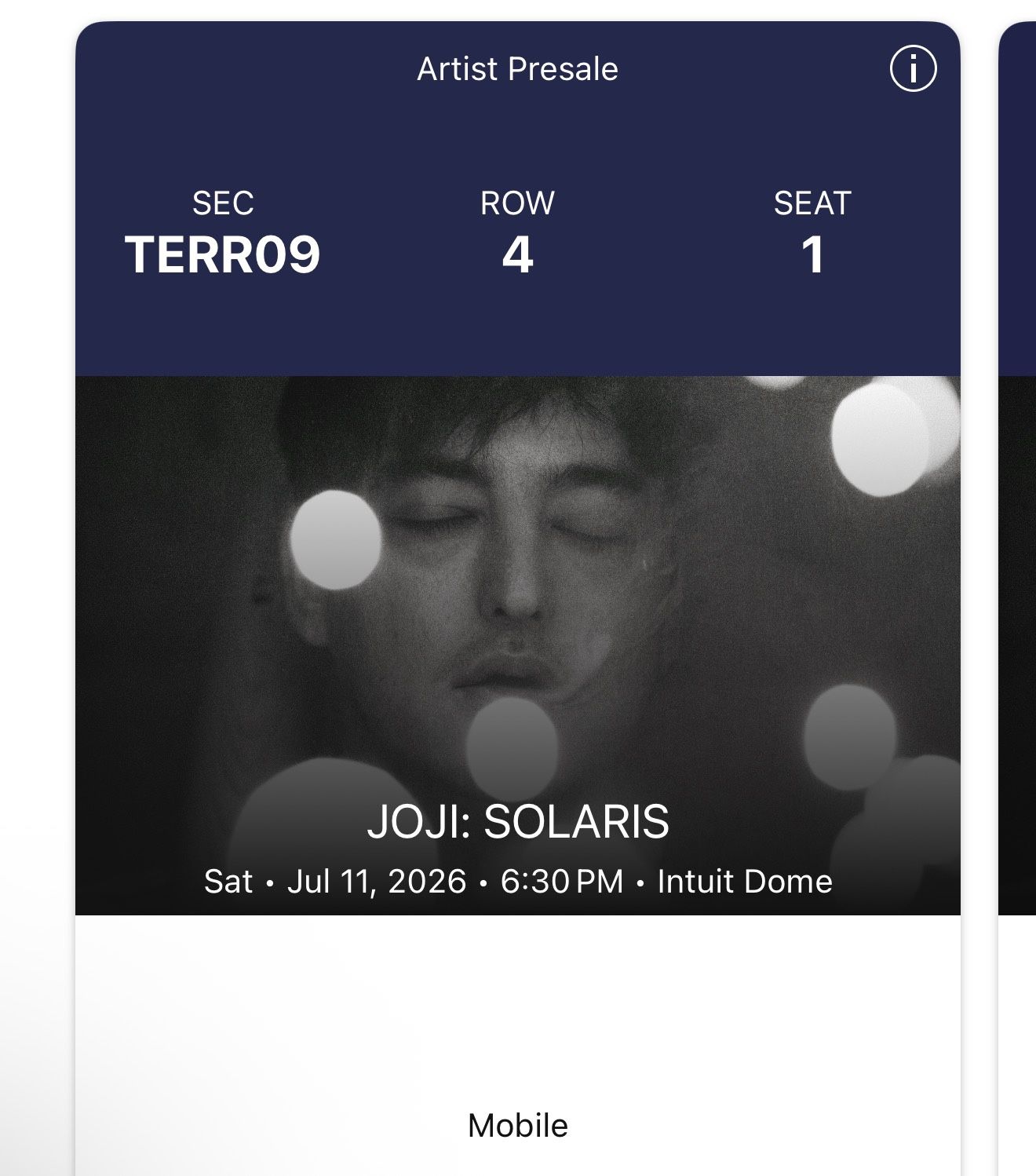 Joji - Solaris Tour Los Angeles 2 tickets Section TERR 09 Row 4 Seats 1 and 2 (aisle seats) $350 for both total. Will meet up to transfer