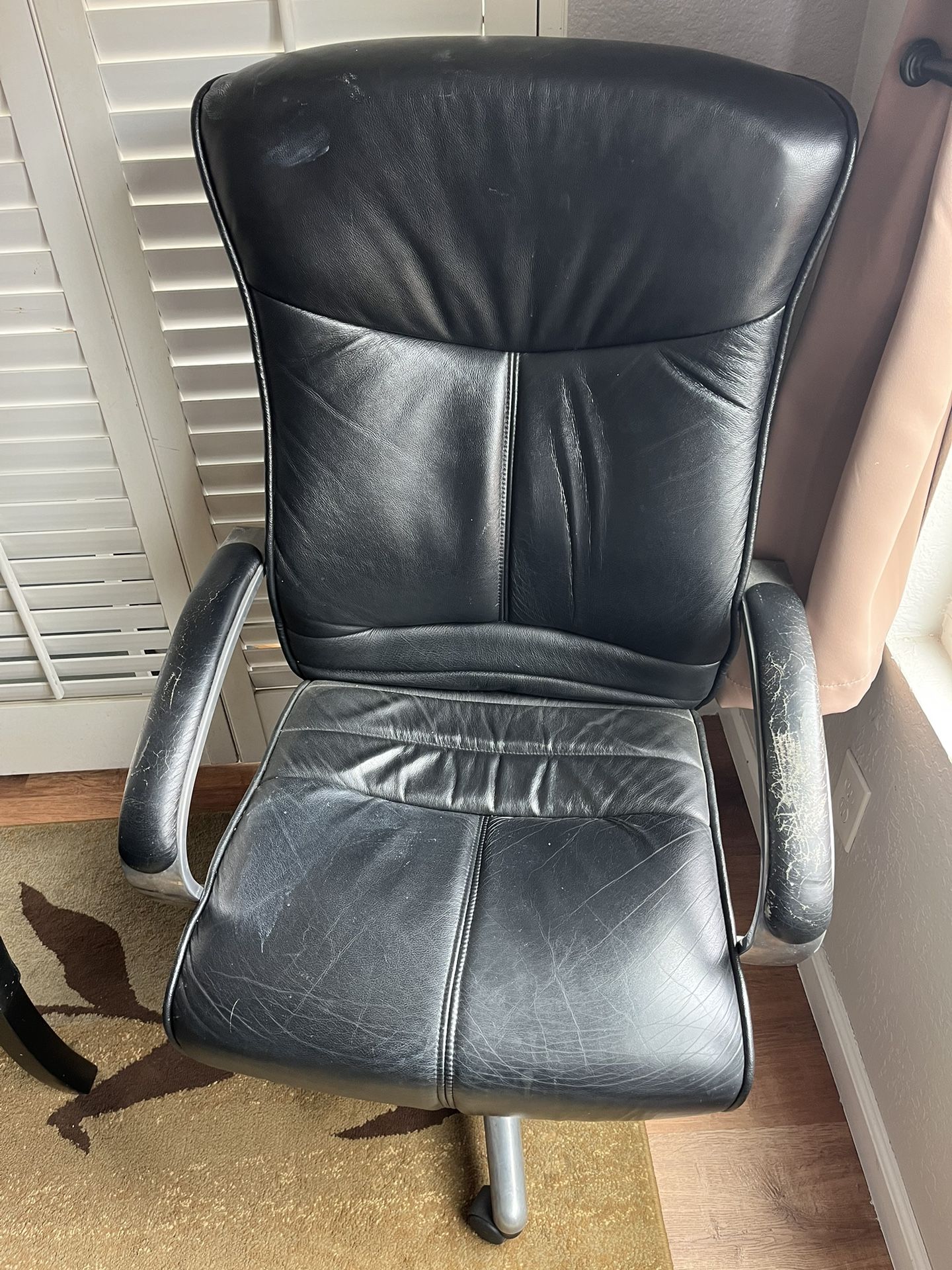 Have 3 computer chairs, leather has wear left arm rest but other than that great condition, all levers work to set to your comfort. Can sell separately. Leather : $30 Cloth: $20 each