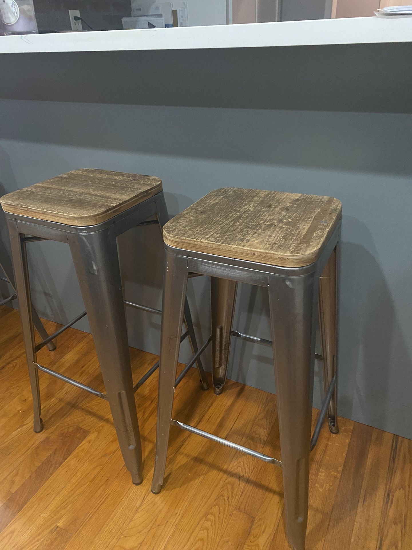 Set of 3 barstools- industrial style. Metal legs and wood look top. Good condition . Height 30.5 in.