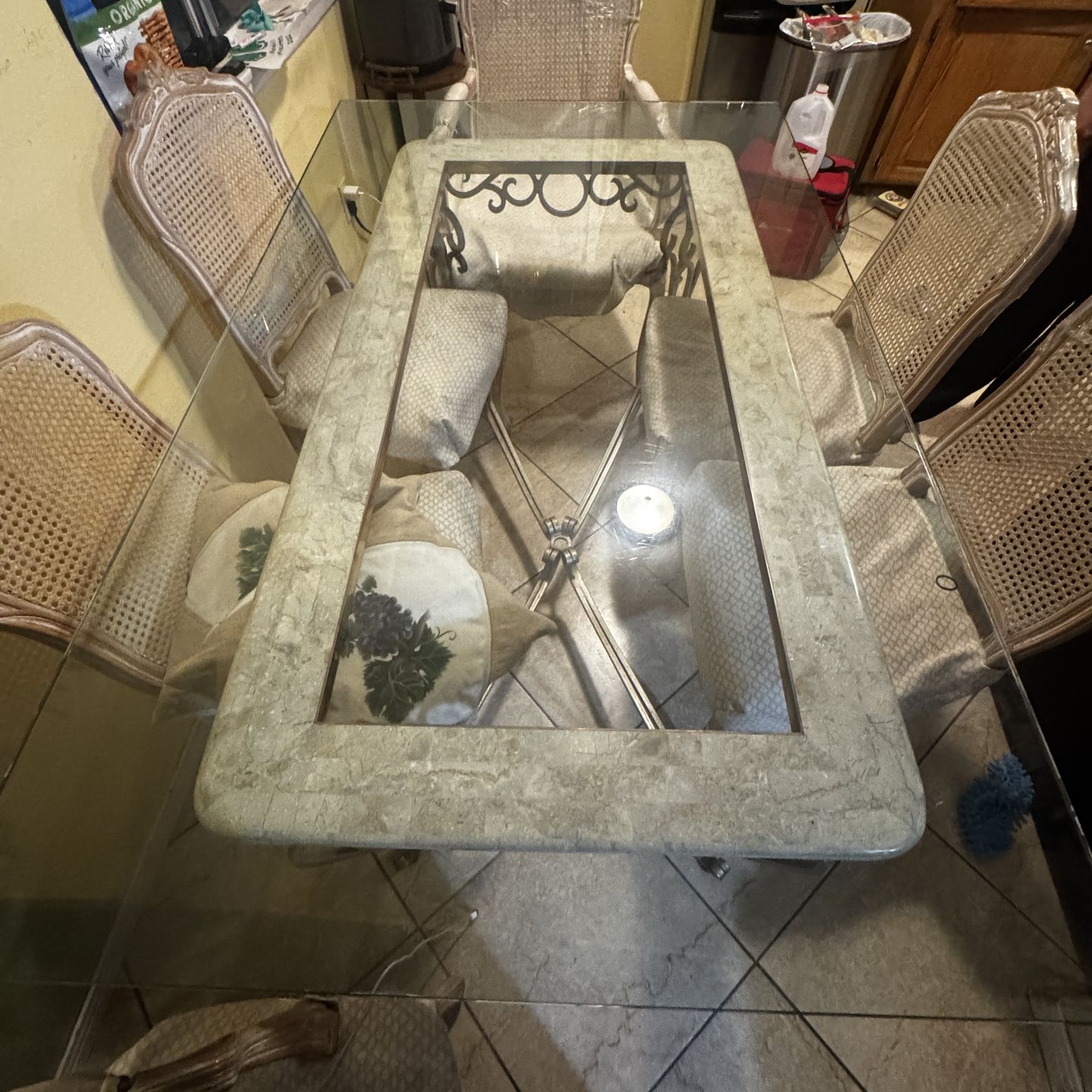 Tempered Glass Dining Table 65x40x.5 inch glass table. The glass top is about 1.5 years old and was priced at $600. The bottom table legs are included as well. Chairs are not included due to them being worn out but more than welcome to take if wanted.