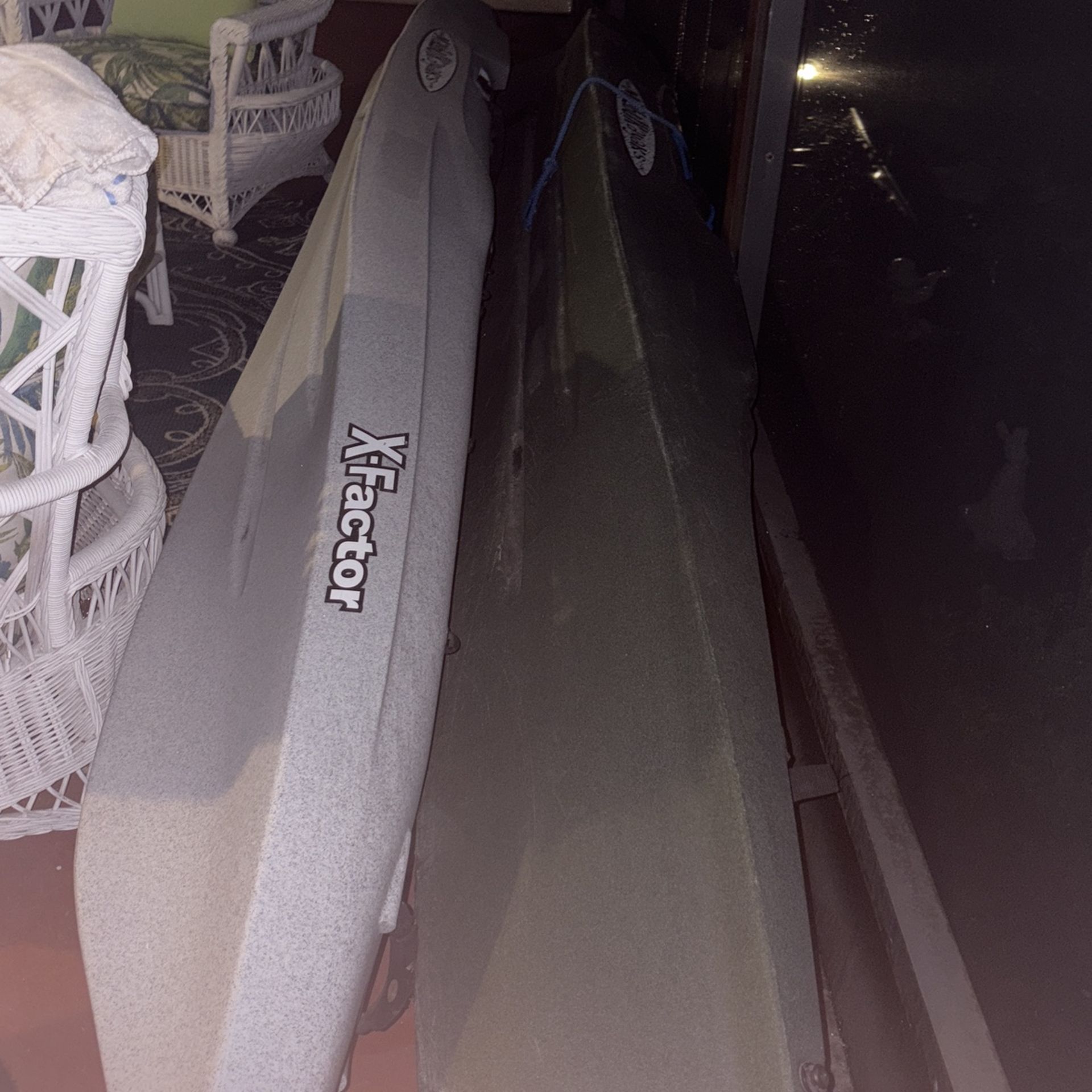 2 fishing kayaks one gray, and one olive green Single seat used 6 times. 2 paddles paid 900.00 apiece and 200.00 for each paddle