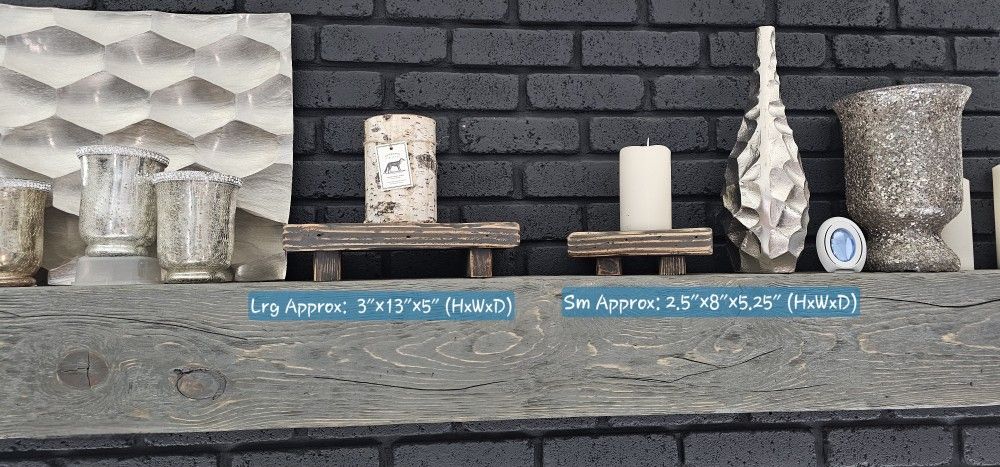 Hand crafted Mini Rustic shelf risers from reclaimed wood, with weathered oak stain and satin polyurethane sealer. Home decor to display small decor or as itself. Large approximately 3x13×4.75 Small approximately 2.5×8×5 Selling as a set. Measurements are inches (HxWxD). LO/CO. No decor is included, just risers only.