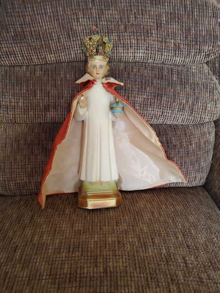 Dated 1955, this statue stands at 14", which includes the top of the crown. The colored stones are glass.